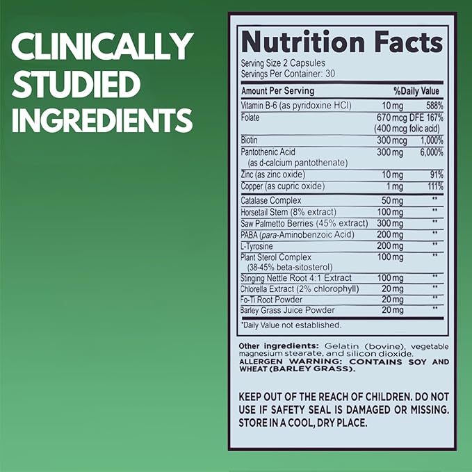- Clinically Studied Ingredients with Antioxidant Properties - Optimized for Healthy Hair and Restoring Natural Hair Color. Prevent your hair from turning gray and reverse signs of aging: This supplement promotes thicker, healthier hair and will help you reverse the signs of aging and portray a much younger look. The hair supplement contains Catalase, Saw Palmetto, Vitamin B-6, Zinc, and many other nutrients.