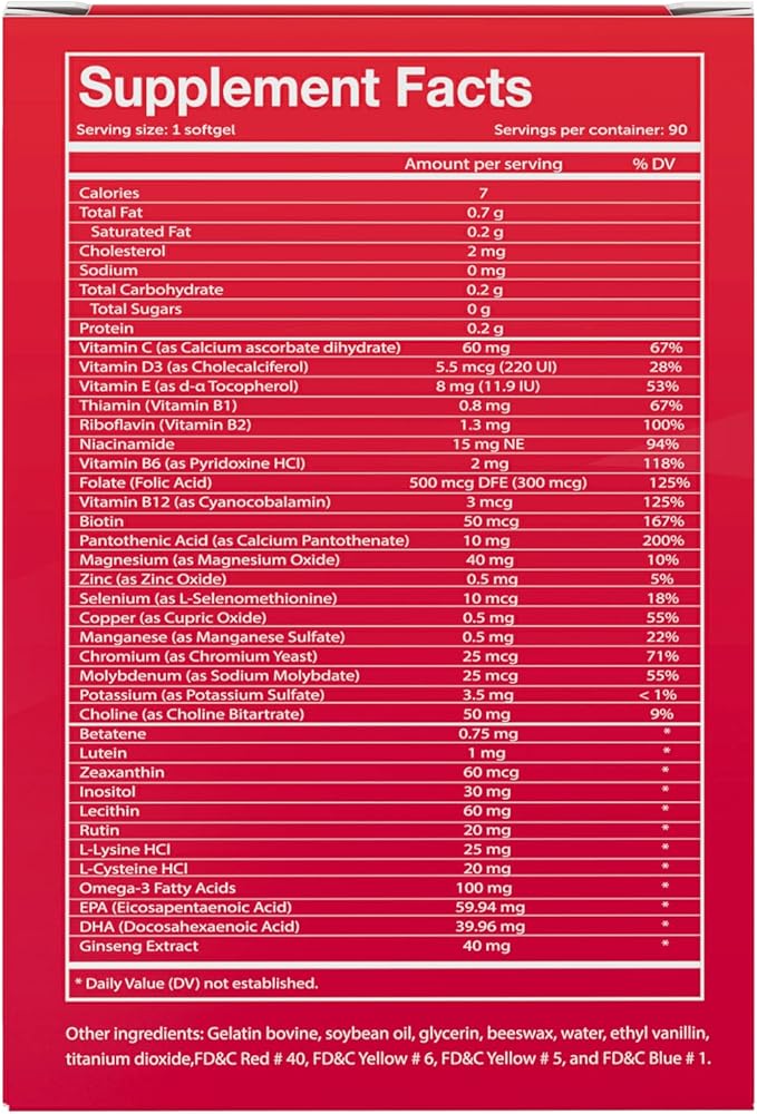 - Special Ingredients : Vitamin C (as Calcium ascorbate dihydrate), Vitamin D3 (as Cholecalciferol), Vitamin E (as d-a Tocopherol), Thiamin (Vitamin B1), Riboflavin (Vitamin B2), Niacinamide, Vitamin B6 (as Pyridoxine HCl) Folate (Folic Acid), Vitamin B12 (as Cyanocobalamin), Biotine, Pantothenic Acid (as Calcium Pantothenate), Magnesium (as Magnesium Oxide), Zinc (as Zinc Oxide), Selenium (as L-Selenometionine), Copper (as Cupric Oxide), Manganese (as Manganese Sulfate), Chromium (as Chromium Yeast), Molybdenum (as Sodium Molybdate), Potassium (as Potassium Sulfate), Choline (as Choline Bitartrate), Betatene, Lutein, Zeaxanthin, Inositol, Lecithin, Rutin, L-Lysine HCl, L-Cysteine HCl, Omega-3 Fatty Acids, EPA (Eicosapentaeonic Acid), DHA (Docosahexaenoic Acid), Ginseng Extract, titanium dioxide Vitamin C (as Calcium ascorbate dihydrate), Vitamin D3 (as Cholecalciferol), Vitamin E (as d-a Tocopherol), Thiamin (Vitamin B1), Riboflavin (Vit… See more