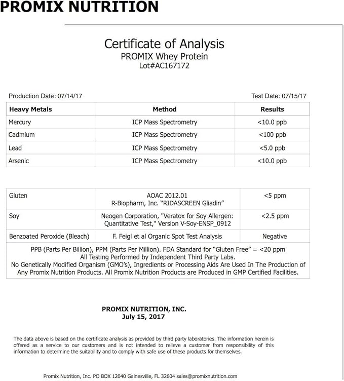 • Seriously Clean: Whey Protein Powder is made without casein. All Promix products are free of gluten, soy, GMOs, hormones, antibiotics, refined sugar, artificial sweeteners, stevia, gums, fillers, and bleach. 94% of ingredients sourced from North America. Partner of 1% for the Planet. Produced in facilities using GMP (Good Manufacturing Practice) standards.