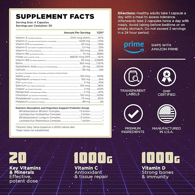Old School Vintage Base 2-in-1 Multivitamin & Probiotic, Daily Vitamins & Minerals for Optimized Digestion, Intestinal Flora, Immune, Vitamin D3, C, & Zinc for Men & Women - 120 Veggie Caps