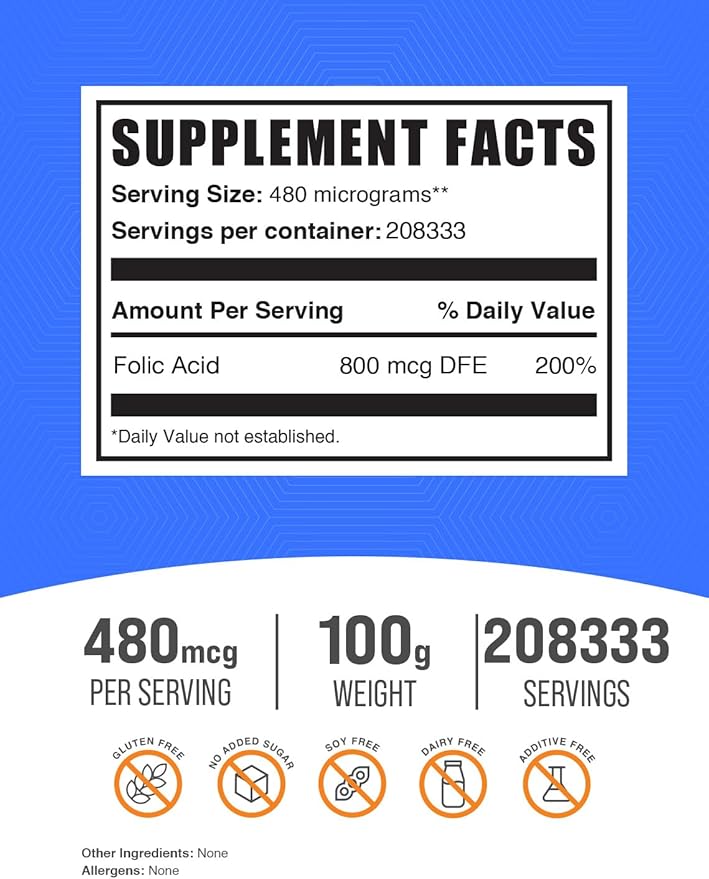- Daily Dose of Well-being: Incorporating our Pure Folic Acid powder, in Folic Acid 800 mcg, into your daily routine is a simple, yet profound way to invest in your long-term health. A small step today paves the way for substantial wellness benefits tomorrow.