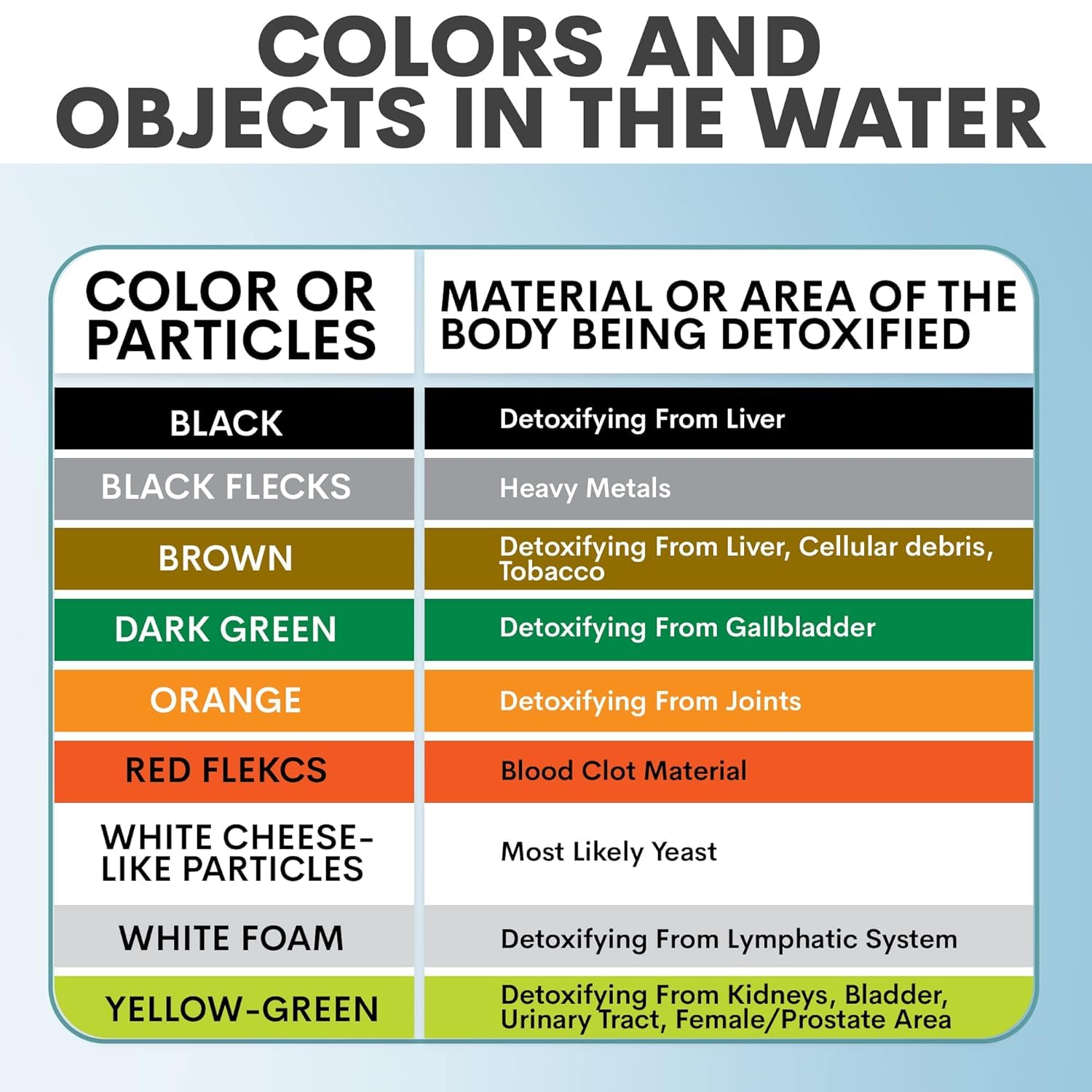 - WHAT’S IN THE BOX - This ionic detox foot bath machine comes with everything you need to enjoy a relaxing and cleansing foot bath at home. You will get a controller unit, a 1/4 lb. bag of Detox Sea Salt, two reusable arrays, a white 12QT basin, an instruction manual, an ionic detox foot bath brochure, and a 16-page informational booklet.