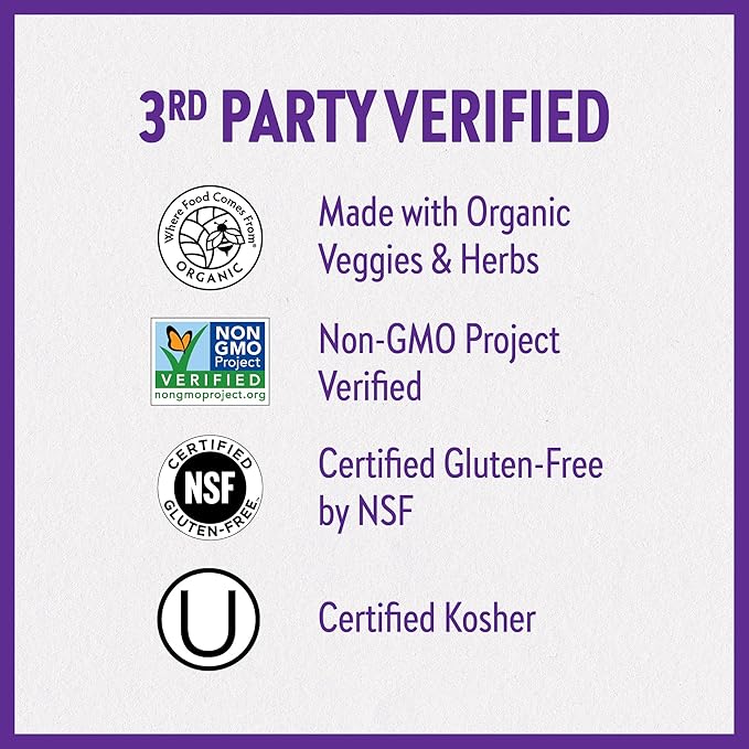 - Made with Certified Organic Algae, Non-GMO Project Verified, Certified Kosher, Certified Gluten Free by NSF, 100% Vegetarian, Certified Vegan, No Synthetic Fillers, Artificial Flavors, Colors, or artificial preservatives, No Sugars, No animal byproducts