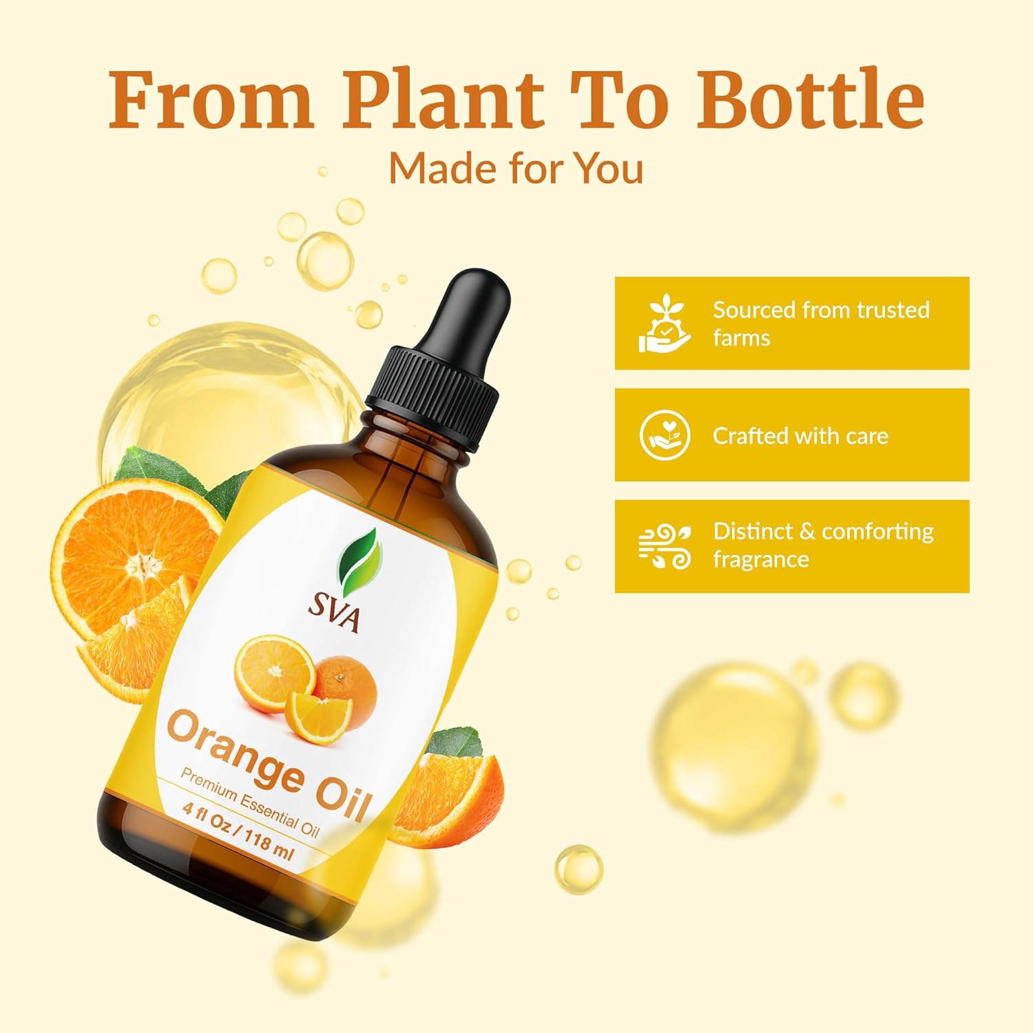 - Premium Quality Orange Essential Oil: SVA Orange Essential Oil 4oz is an essential oil and is obtained by cold-pressed extraction of Citrus Sinensis rind. Our Orange essential oil is free of preservatives and comes with a dropper for easy application. It is not tested on Animals. We care for you