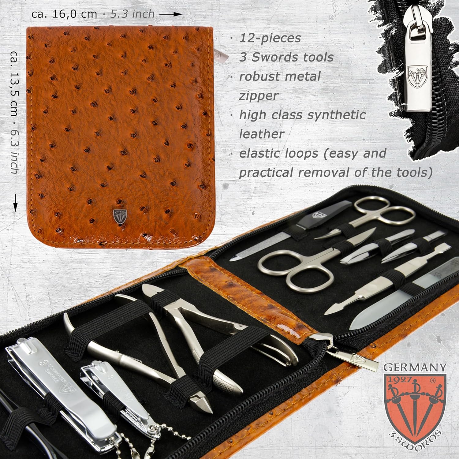 - CASE: Synthetic leather bostrich cognac, size ca. 17,0 x 14,0 x 3,0 cm. Our organizers are made of high-grade fashion or classic materials. Additional equipment: Microfiber cleaning cloth for cleaning steel items, general info sheet “Finger - Nail Grooming”.