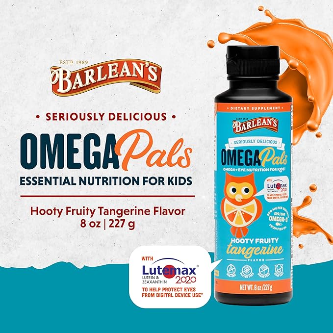 Barlean's Omega Pals Eye Health Liquid, Tangerine Flavored Omega 3 for Kids, Fish Oil Supplement with 500 mg of EPA & DHA Plus Lutein & Zeaxanthin Vitamins for Blue Light Support, 8 oz