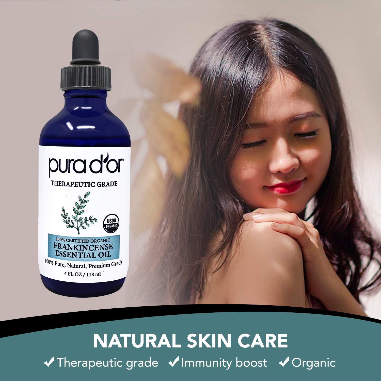 PURA D'OR ORGANIC Frankincense Essential Oil (4oz with Glass Dropper) 100% Pure & Natural Therapeutic Grade For Hair, Body, Skin, Aromatherapy Diffuser, Relaxation, Meditation, Mood, Massage, DIY Home