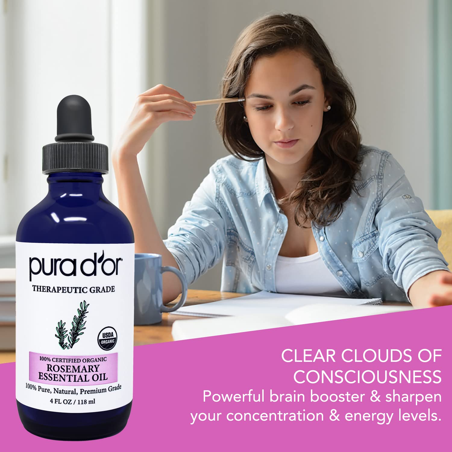 PURA D'OR Organic Rosemary Essential Oil, 4oz, Therapeutic Grade, for Hair, Body, Skin, Aromatherapy, Relaxation, Massage, Mood, Relief, Home, DIY Soap