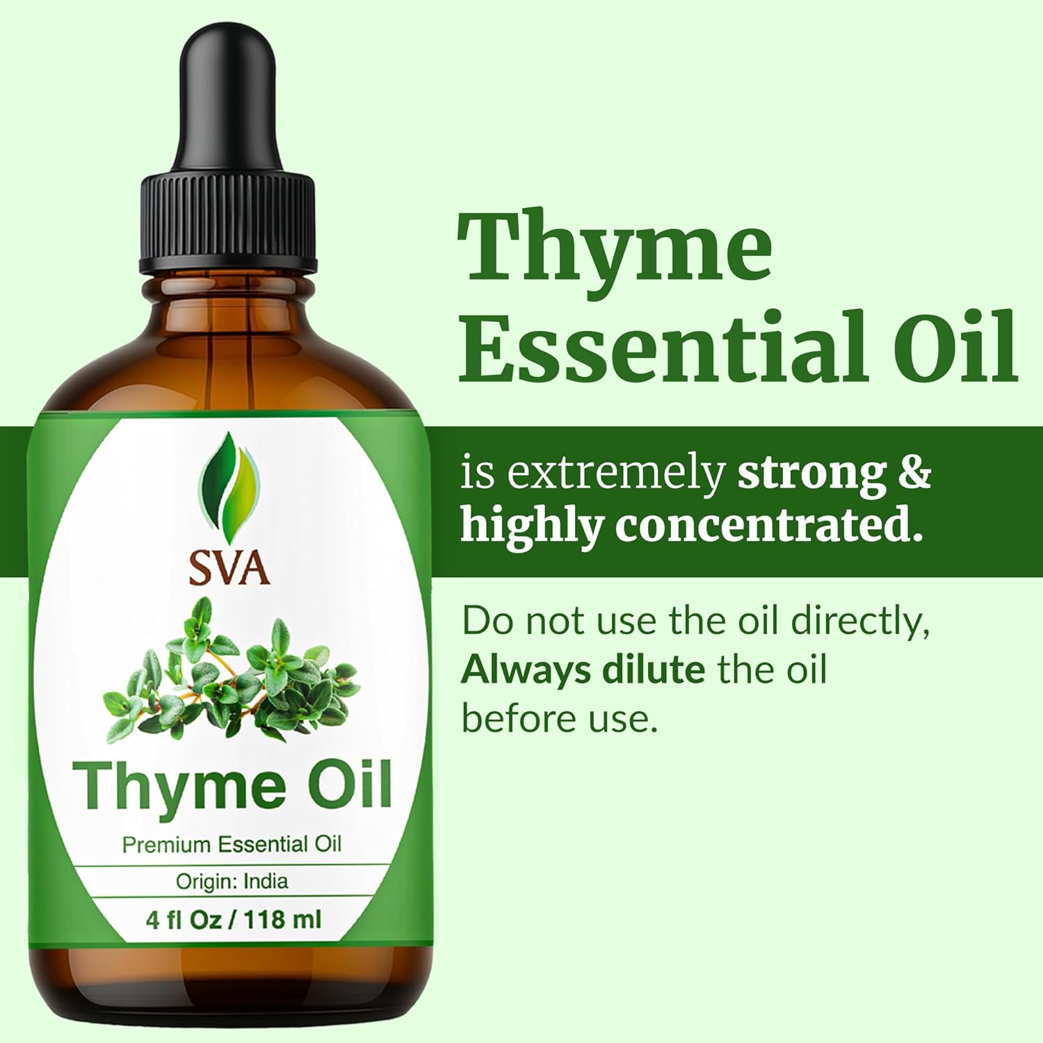 - Important Note: SVA Thyme oil is highly concentrated. Do not use it directly on skin and hair. To use the oil correctly, always dilute only 1-2 drops of the essential oil with a carrier oil. Thyme oil is very potent and must be used sparingly.