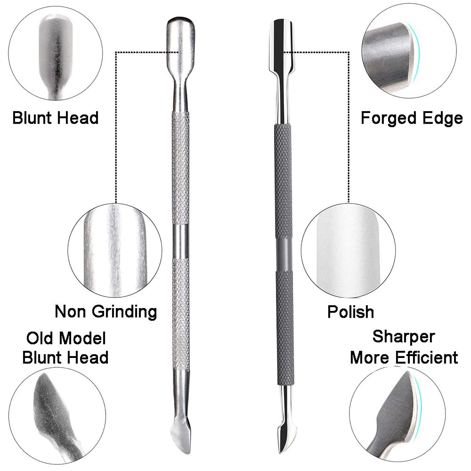 - Dual End Nail Pusher & Perfect for Cuticle Removal: Sharp to cut or scrape away dead cuticle on one end; Curved flat end perfectly pushes the skin back flawlessly; Durable metal resists wear and tarnish