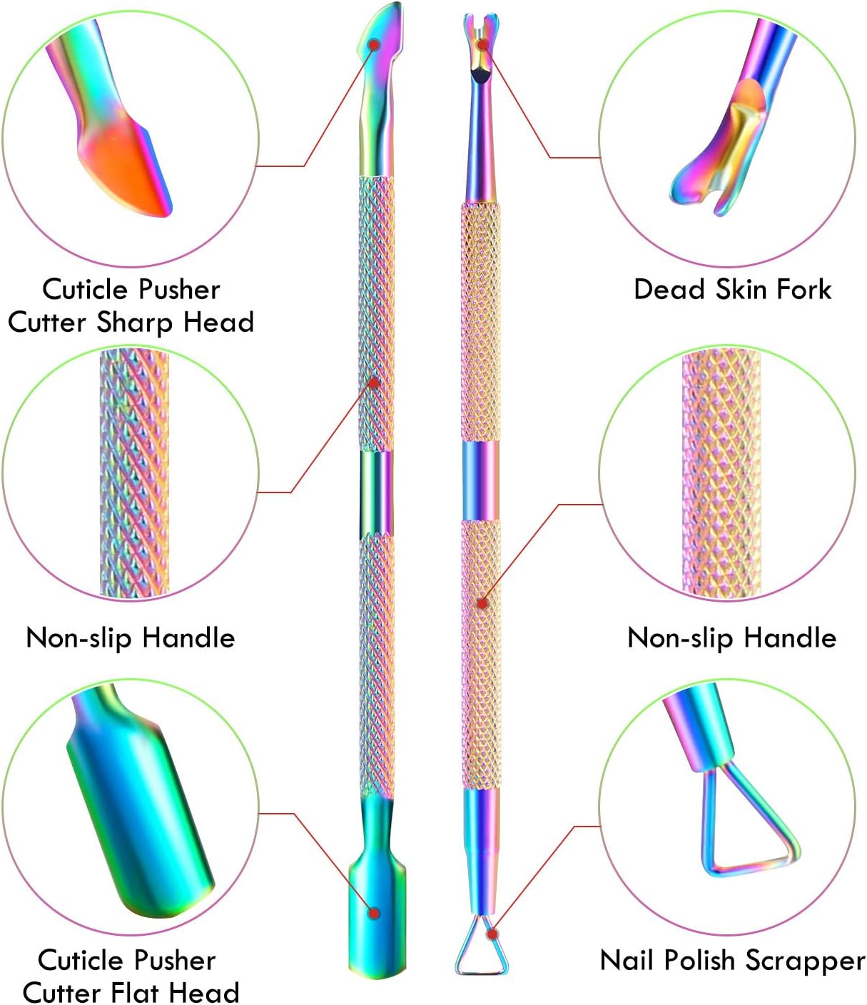 - Ergonomic Non-slip Handle Design -- Our professional cuticle remover tools set is designed with an ergonomic non-slip handle, providing you with a comfortable hand feeling, you can remover the cuticles more effectively. In addition, the chameleon design makes it a beautiful set of color manicure artwork.