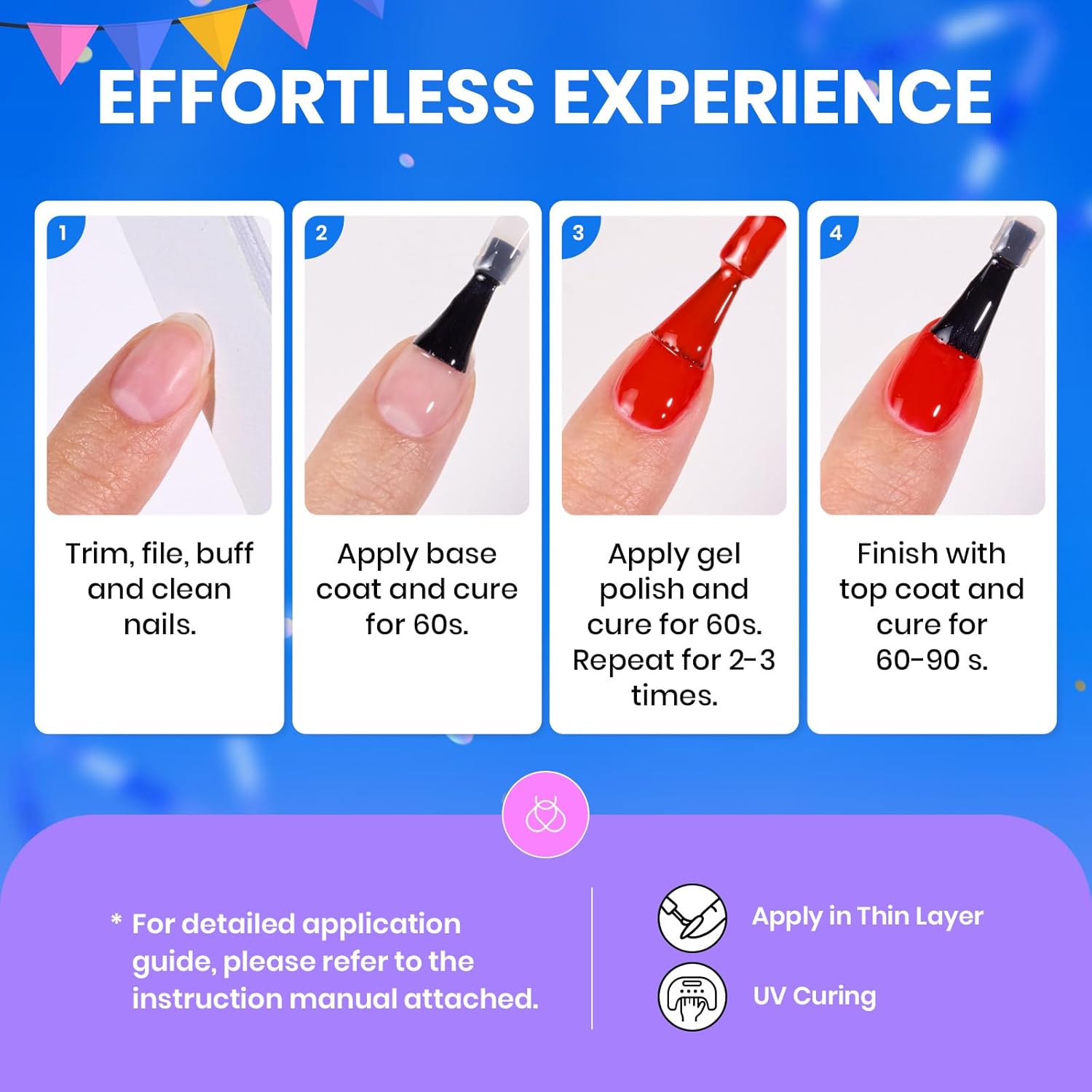 - Soak off LED Nail Dryer Gel Nail Polish: The 2024 unicorn gel nai polish kit beauty gift sets with red, neon orange, yellow, neon green, turquoise, baby blue, purple glitter nude pink gel polish set need to be cured under LED Lamp. Base and Top coat required. Average for LED Nail Lamp 60-120 secs.