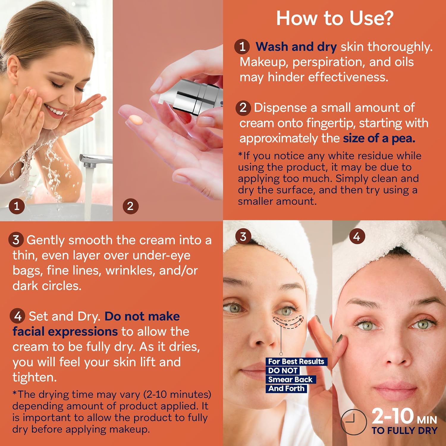 - Instant Results - The active ingredients in our proven effective formula will create a temporary tightening layer on your skin that lifts, tightens, and smooths the skin, instantly lifting wrinkles, smoothing under-eye bags and smile lines in as short as 2 minutes. Besides the instant result, the various kinds of peptides will nourish your skin and make your skin look younger in the long term using.