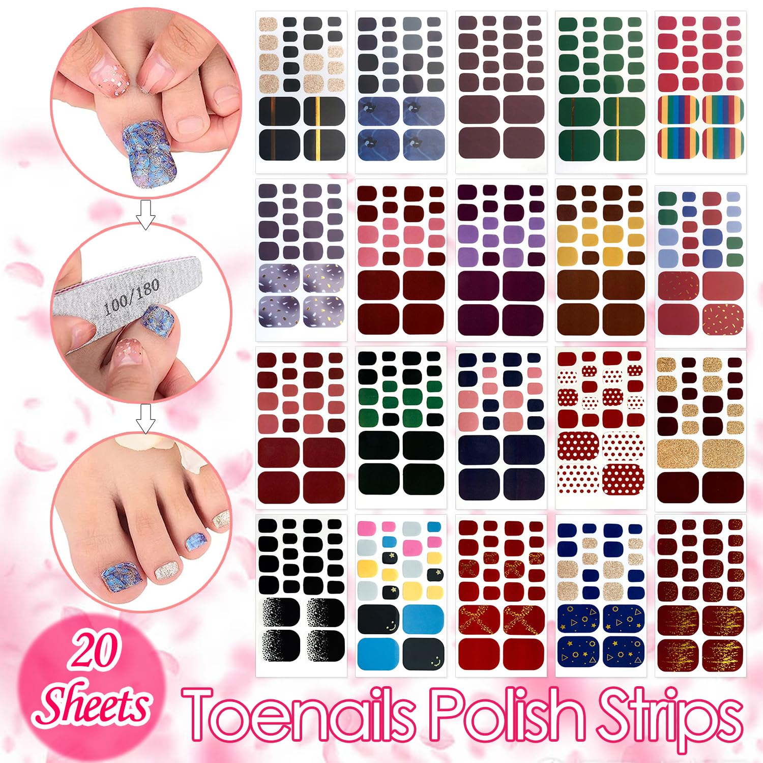 SILPECWEE 20 Sheets Adhesive Toe Nail Polish Stickers Decals Solid Color Full Wraps Nail Strips Manicure Accessories for Women 1Pc Nail File