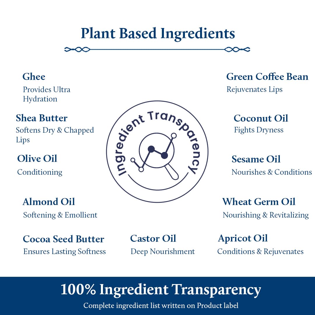 - DEEP HYDRATION & MOISTURIZATION: The skin of the lip is thinner than the facial skin and tends to lose moisture quickly. The lip balm with Ghee along with Vitamin C works against Dry and Chapped Lips for long lasting gloss and shine. Natural Oils and butter help to seal the hydration to give healthy, supple and pout ready lips. elastic and supple skin.