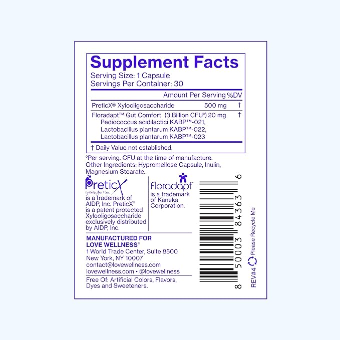 - SUPPORT GUT HEALTH AND IMMUNITY: Love Wellness Gut Feelings Probiotic is an innovative trio of prebiotics, probiotics, and postbiotics created to support a calm gut and strong immune system.* 3 billion CFUs of probiotic strains work to support healthy gut function, digestive relief, and overall health.* Contains prebiotic fiber to keep things moving and help with occasional gas relief.* Serving size 1 capsule, 30 servings per bottle.