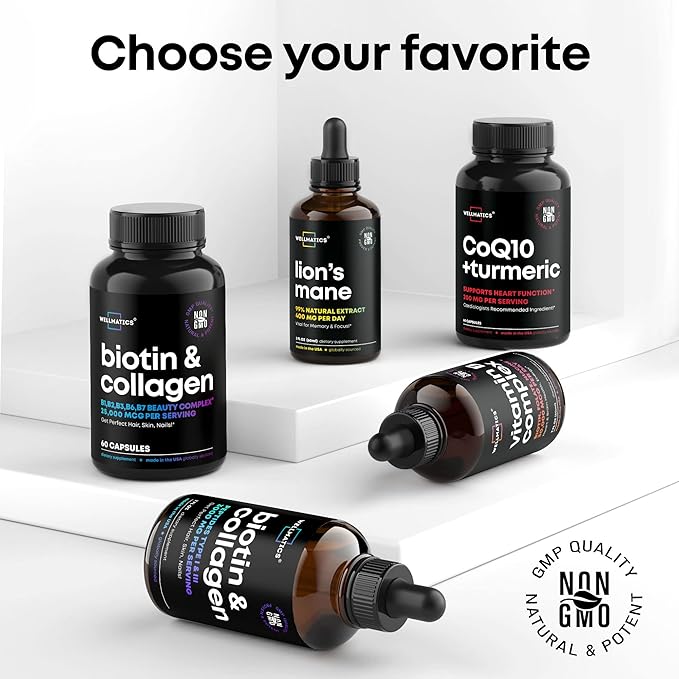 - Pure Vitamin-Dense Biotin Pills - Wellmatics hair vitamins for women and men are made by Americans for Americans. Only premium and pure ingredients. Our Biotin, Keratin, Collagen pills are easy-to-take and don't contain any GMOs, Artificial Colors, Gluten, and Corn Syrup, no fillers, titanium dioxide and artificial colors. Only natural sources and clinically proven compounds for your health and beauty!