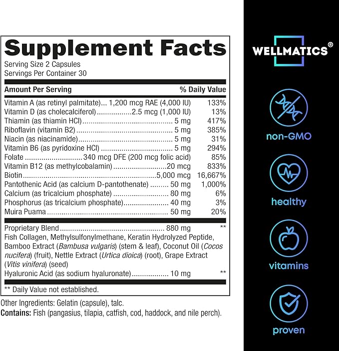 - Biotin for Hair Growth - Wellmatics proprietary multivitamin complex is specially designed to contain all the most vital elements for your healthy hair, skin and nails, increased energy levels and overall health and beauty: Biotin (Vitamin B7), Fish Collagen, Keratin, Vitamin A, Vitamin D, Vitamin B1, Vitamin B2, Vitamin B6, Vitamin B12, Niacin, Folate, Pantothenic Acid, Calcium. The most you can only get.