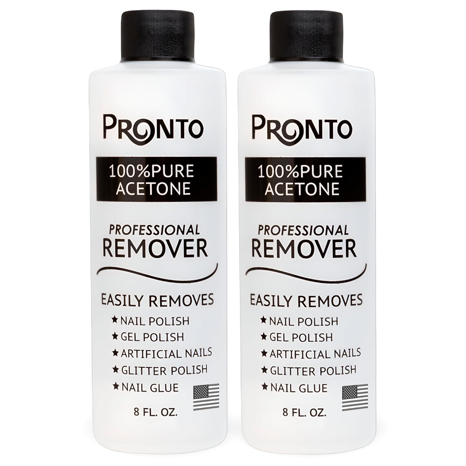 - THE ONLY ONE YOU NEED: Pronto Pure Acetone easily removes nail polish, gel or shellac polish, sculptured nail forms and nail art, artificial nails, glitter polish or nail glue. You can use our professional acrylic nail remover straight from our bottle or from an acetone dispenser.