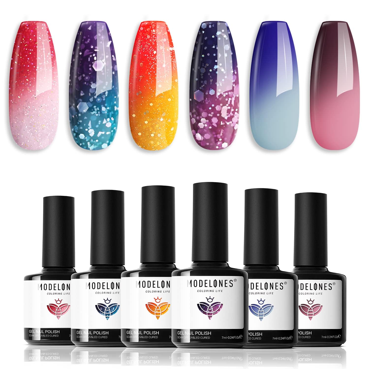 modelones Color Changing Gel Nail Polish Set, 6 Colors Red Pink Glitter Blue Purple Mood Temperature Change Nail Polish Gel Set Soak Off Nail Art Gel DIY Salon Manicure Gift