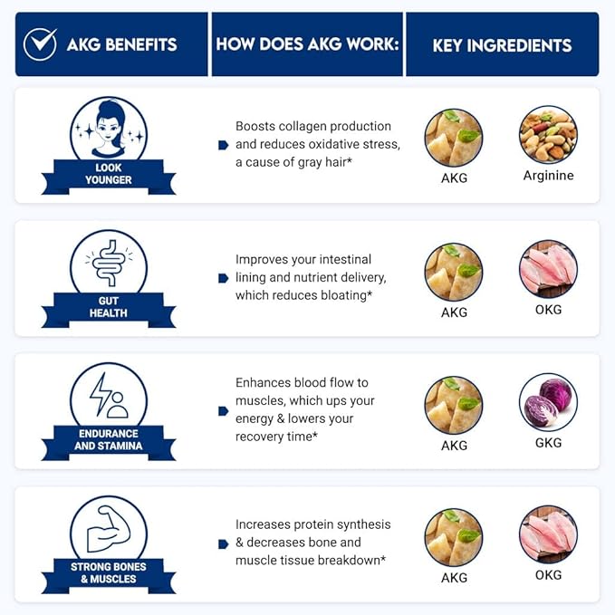 - HEALTHY AGING - AKG with Arginine supports cellular repair and healthy aging and helps slow gray hairs and wrinkles while improving skin texture and tone