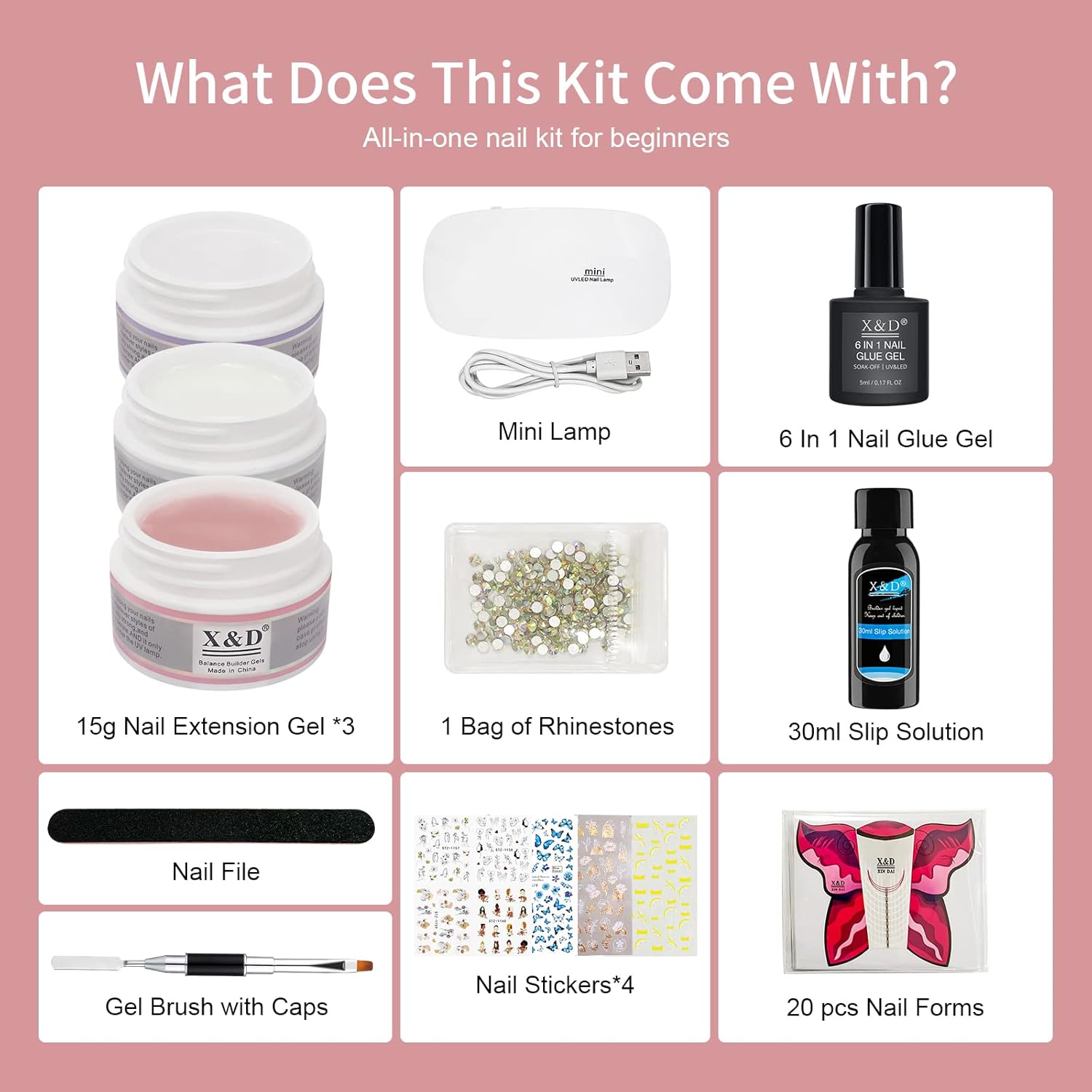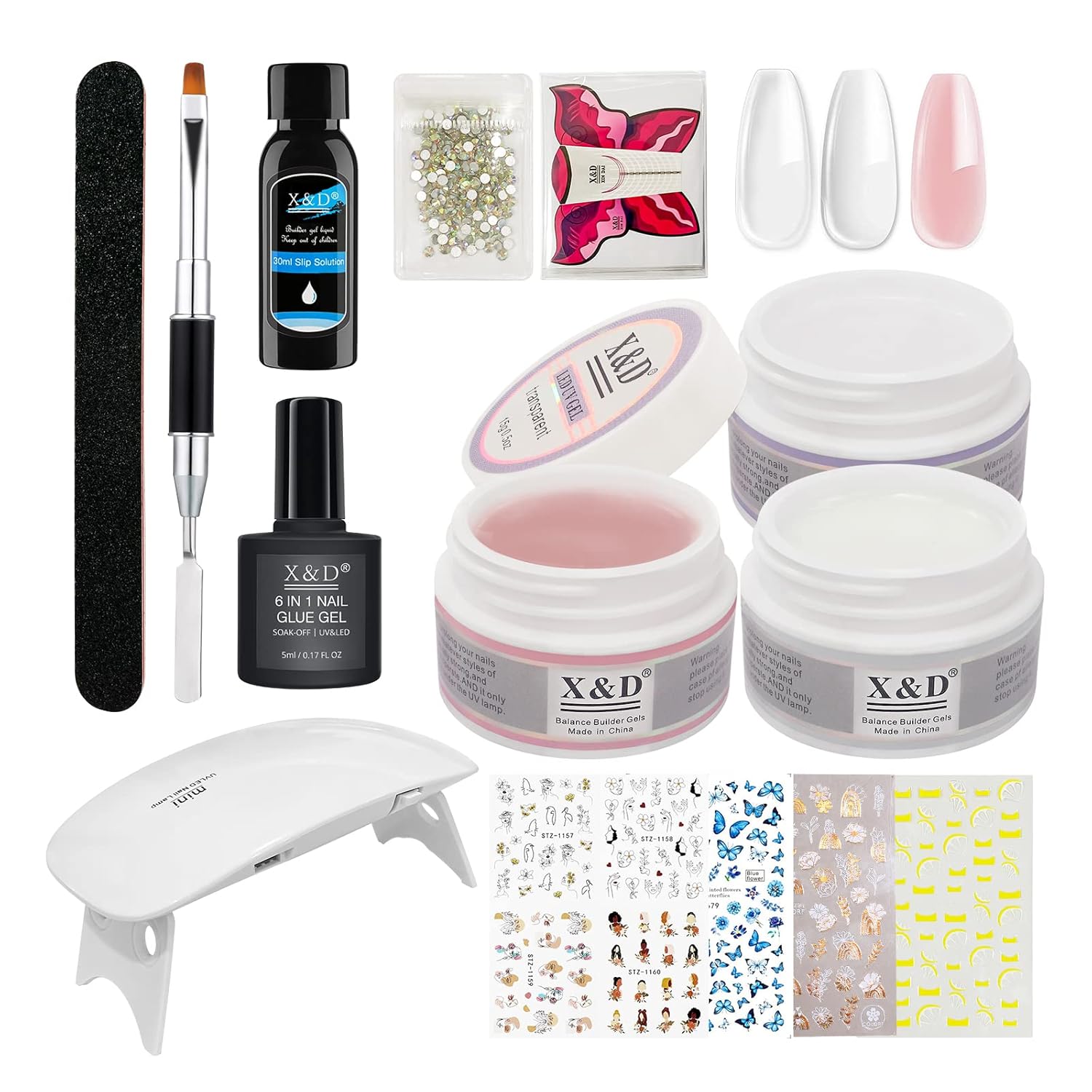 X&D Poly Gel Nail Kit 3 Colors Natural Clear Colors Poly Nail Gel Kit Nail Extension Builder Nail Gel Quick Manicure Home DIY Set for Women (Transparent, Nude Pink, White)