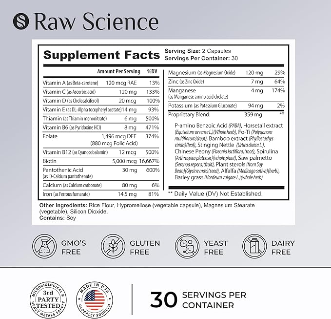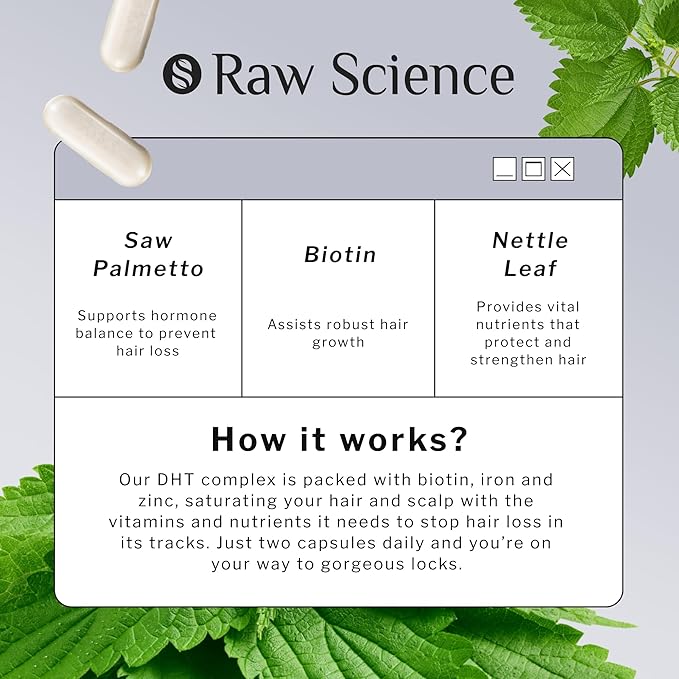 - 【DHT BLOCKER FOR MEN & WOMEN】 – DHT Blocking alongside saw palmetto oil can help repair a receding hairline. These incredible hair loss pills, also known as hair supplements for hair growth, are perfect for those struggling with mens hair loss. Try Raw Science’s anti hair loss DHT blocker to correct hair loss for men.
