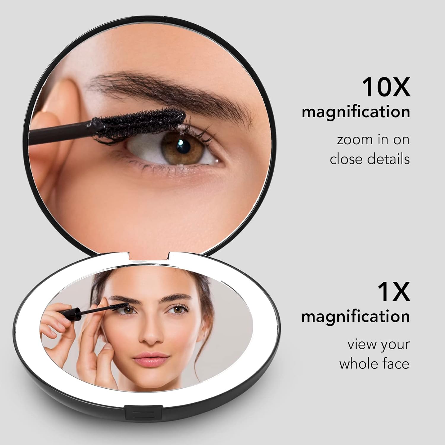 - Double-sided magnification (1x and 10x) so you can apply a full face of makeup, do a quick touch-up on the go, or focus on a detailed task like tweezing or inserting contact lenses