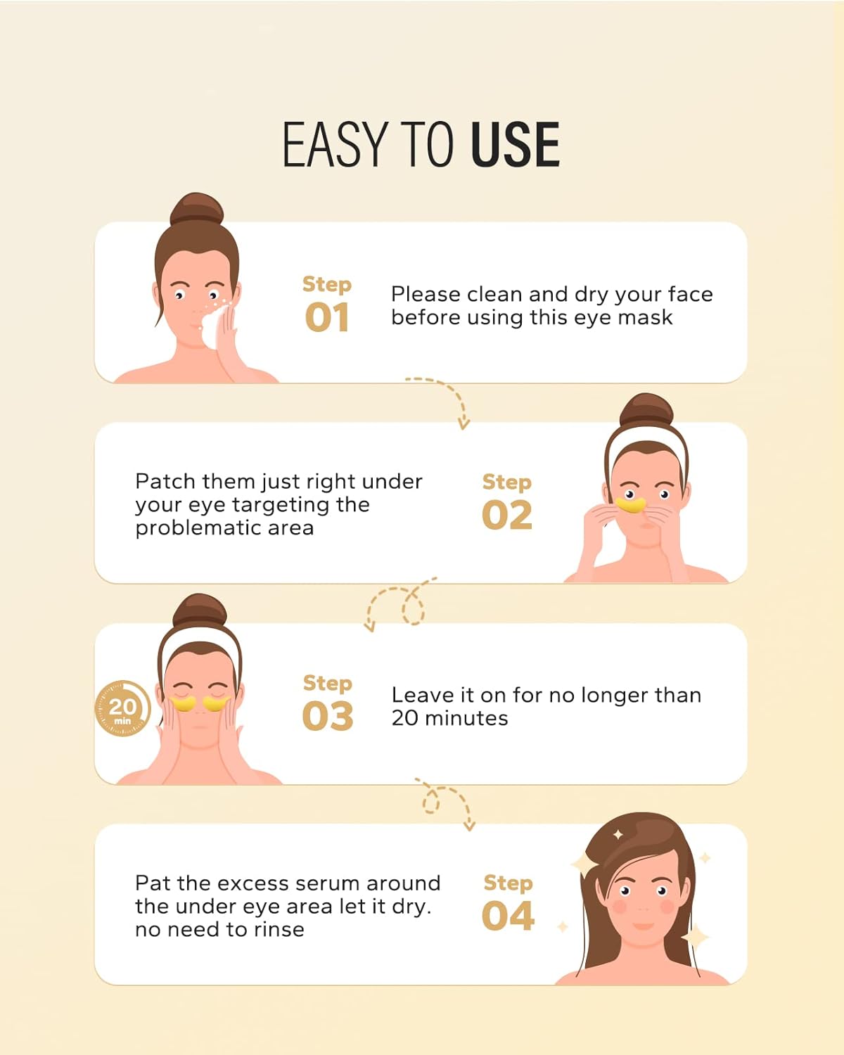 - Easy To Use: Clean your face and eyes with warm water, then put eye pads under your eyes and press gently to secure them. Keep it for 20 minutes, remove the eye pads and gently pat the remaining essence. Twice a day or at least once a week.