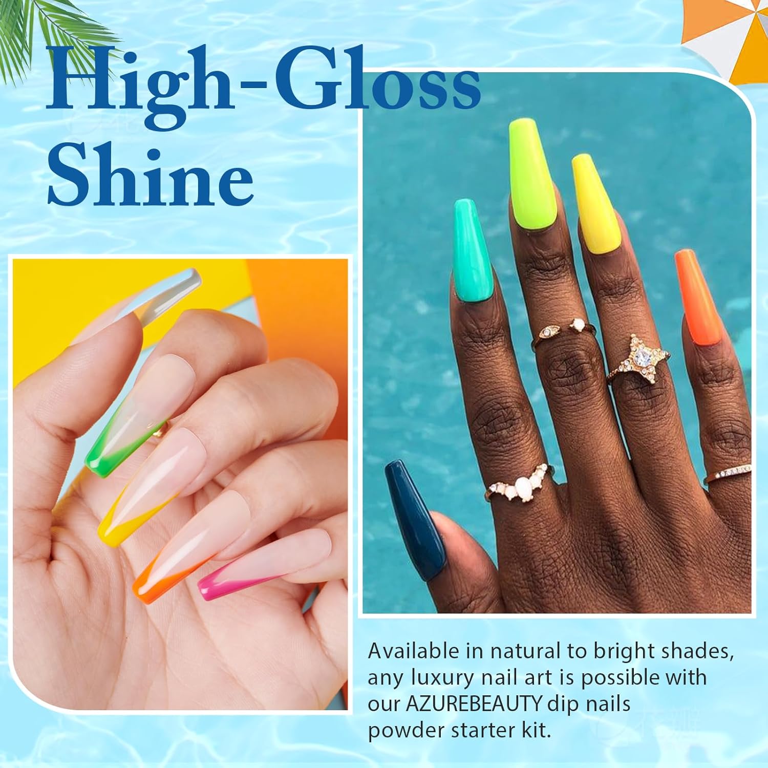 - 【Bright Neon Kit】AZUREBEAUTY All-New Dip Powder Nail Starter Kit includes 20 X Classic colors nail dip powder (0.34 oz. each), 4 X dip powder liquid set (with base coat/top coat/activator/brush saver, 0.34 oz. each), 7*additional professional dip manicure kit tool with 1*nail brush/1*cuticle pusher/nail file/2*dip powder gel brush replacement, 1*nail polishing block(Random color), 1*dip powder recycling tray, user manual quick start guide
