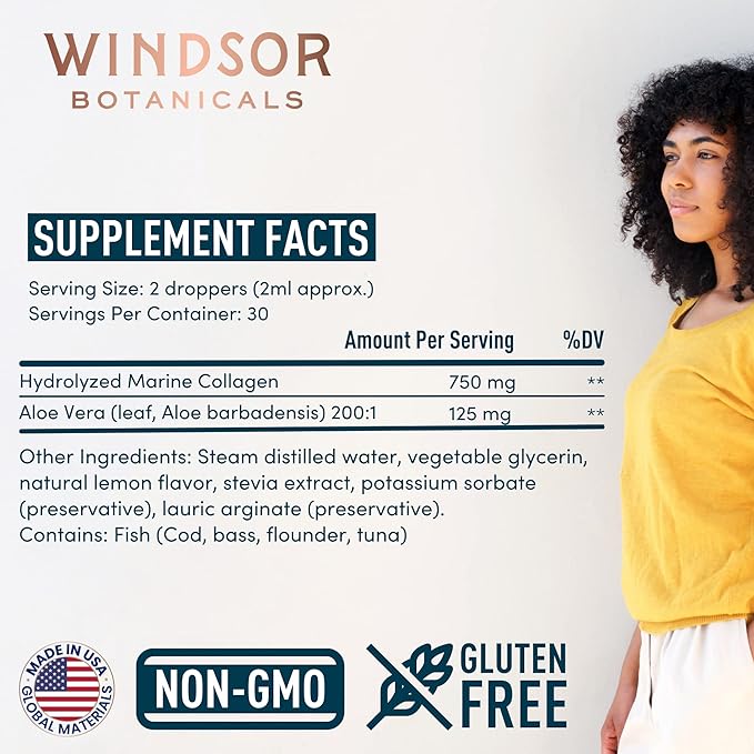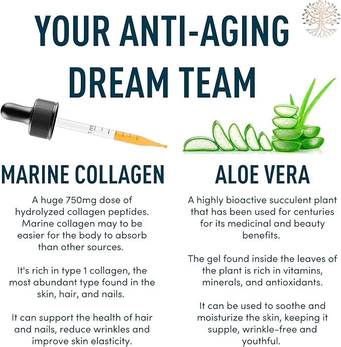 - Nuestro colágeno marino hidrolizado es perfecto para mujeres y hombres. Fortalece cabello, piel y uñas. Aporta 750MG de colágeno y 125mg de Aloe Vera en gotas de 60ml. ¡Cuida tu belleza con nosotros!