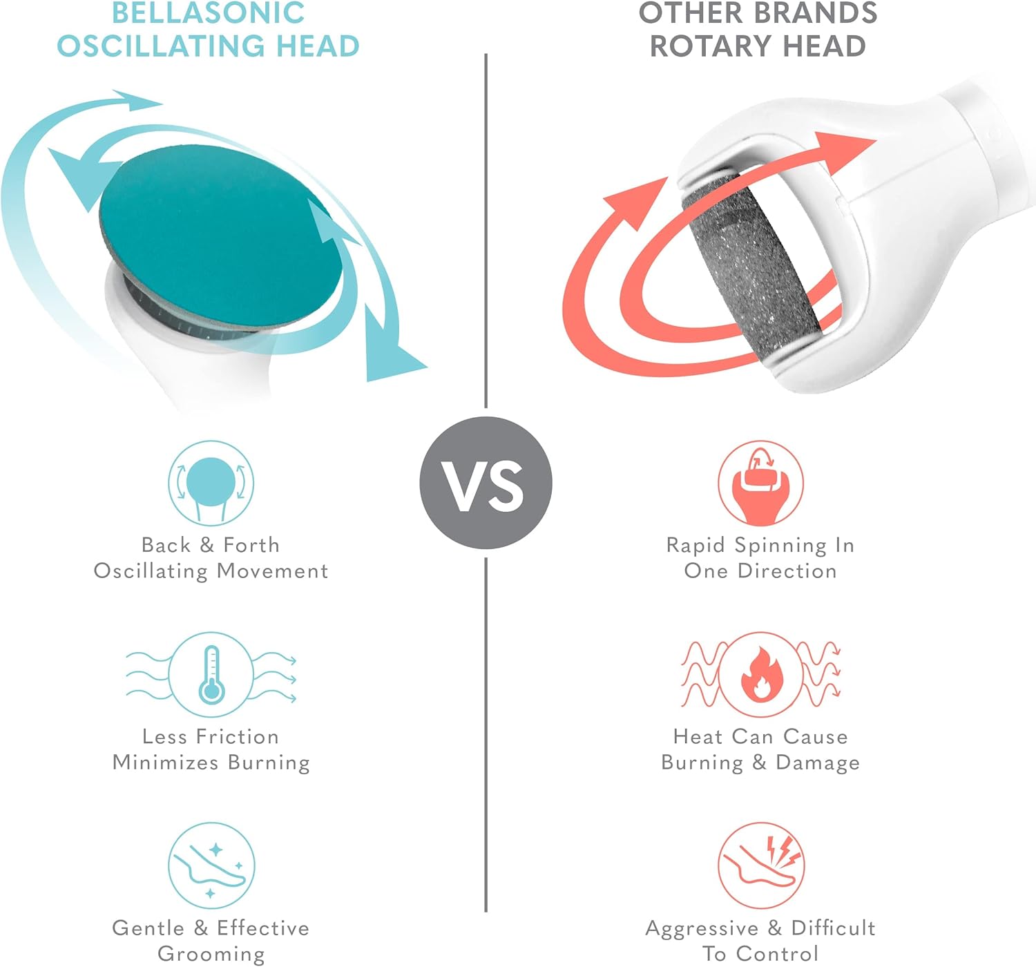- UNIQUE, OSCILLATING HEAD rotates back and forth, rather than spinning all the way around, to prevent excess HEAT and BURNING caused by other fast-spinning foot files.