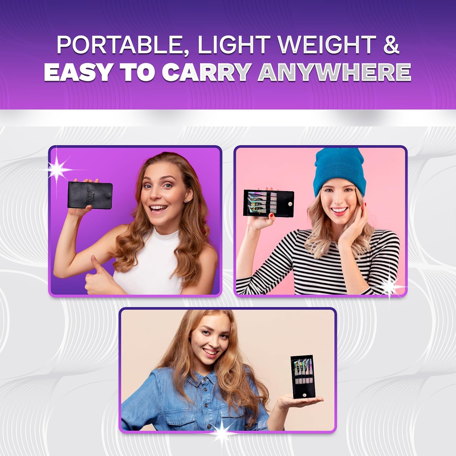 - 5 in 1 Tweezer set with travel case includes 90° Volume, 45° Isolation, Curved, Pointed, and Classic Volume Tweezers—each with a protective cap. Comes in a sleek leather pouch for travel-friendly storage