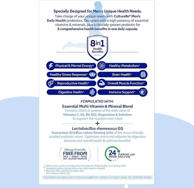 - MULTIVITAMIN POWER: Culturelle probiotics for men also contain vitamin D3, vitamin C, vitamin B12, vitamin B6, and selenium to support energy levels, healthy metabolism, healthy stress response, brain health, reproductive health, and overall muscle function
