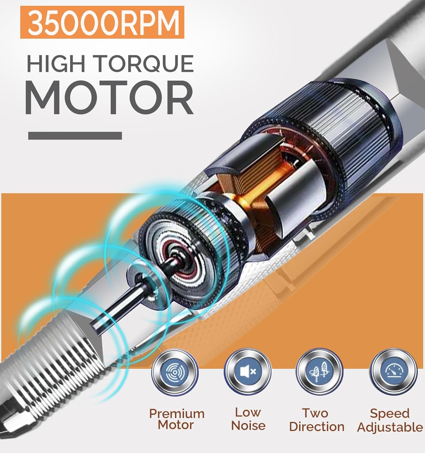 - 【Ergonomic Design for Comfort】 Crafted from aerospace-grade aluminum alloy, this electric nail file weighs only 5oz (lighter than a smartphone!) with a pencil-shaped grip that fits snugly in both left and right hands. Built-in cooling vents prevent overheating, so you can work for hours without hand fatigue. The 3/32" universal chuck works with all standard bits—swap tools in seconds.