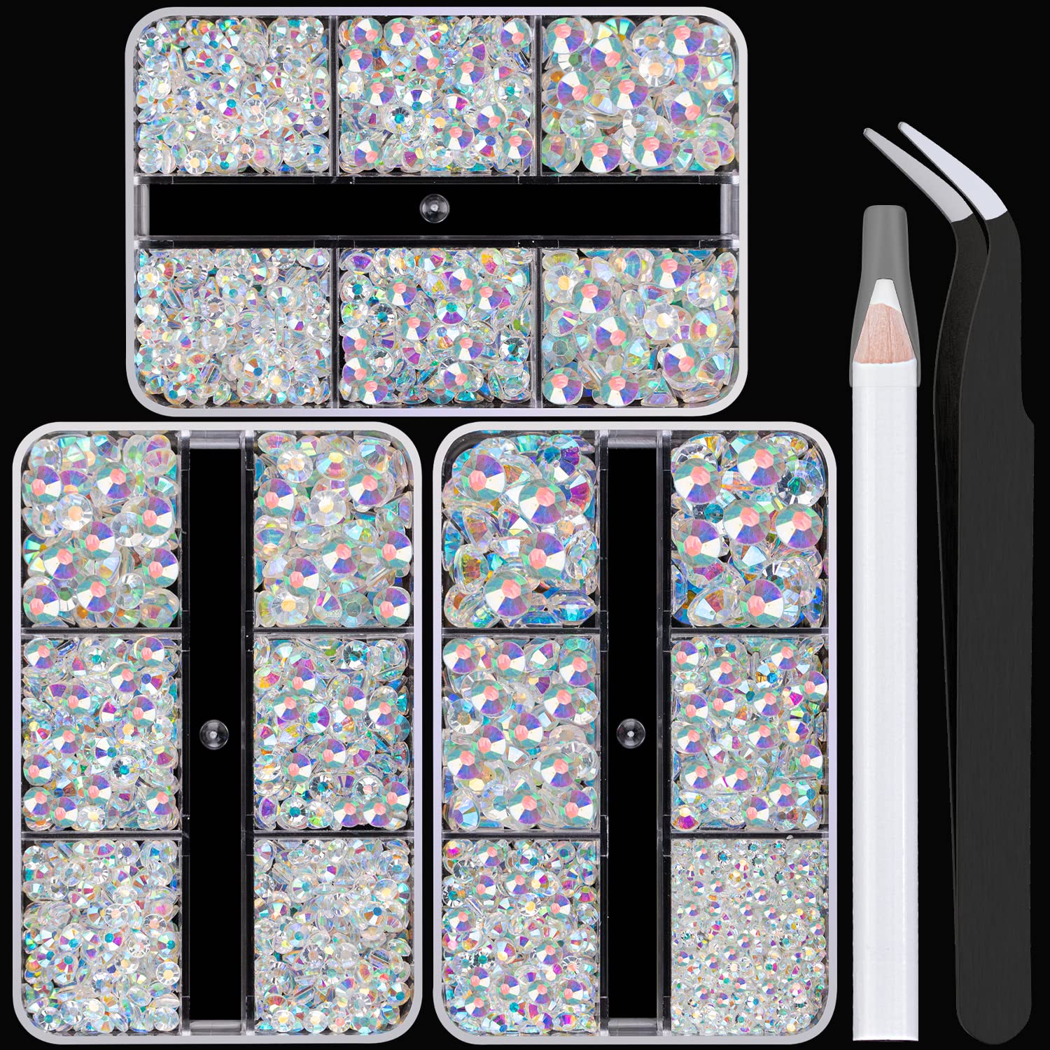 - 💎PACKAGE CONTENT -- This resin rhinestone kit includes 3 boxes, each with 6 grids, featuring a variety of sizes: Box #1 contains 2mm x 1 grid, 3mm x 1 grid, 4mm x 1 grid, 5mm x 1 grid, and 6mm x 2 grids; Box #2 contains 3mm x 2 grids, 4mm x 2 grids, and 5mm x 2 grids; Box #3 is the same as Box #2. A tweezer and a pickup pencil are included for easy rhinestone picking. This set offers more large-size gems, making it perfect for DIY craft decorations, eye makeup, face makeup and nail art.