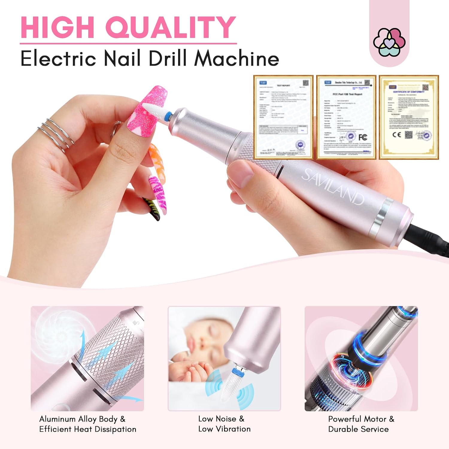 - Low Noise and Low Vibration: Saviland nail drill is made of high-quality material, the handle adopts strong silent torque, intelligent heat dissipation, and low vibration. Low heat, low vibration, low noise, can run smoothly for a long time. This nail drill machine will provide you with a safe and effective nail art experience