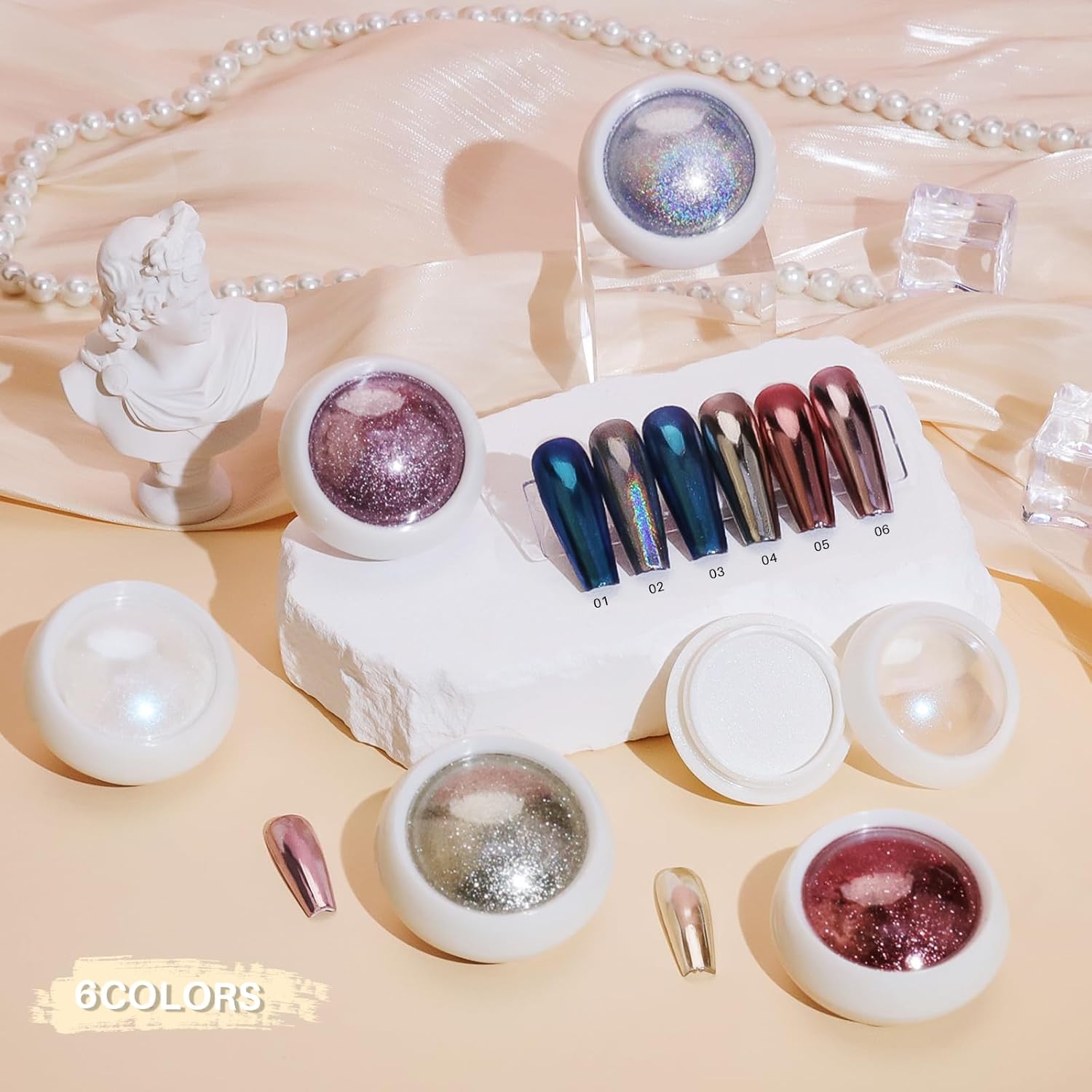- 💕【Shimmer Pearl Chrome Nail Powder】The Chrome Powder for Gel Nails combines pearl shimmer effect powder, and chrome effect powder. It has a shimmer pearl effect, but it does not cover the background colour, but only adds a layer of pearlescent effect to the nail art.