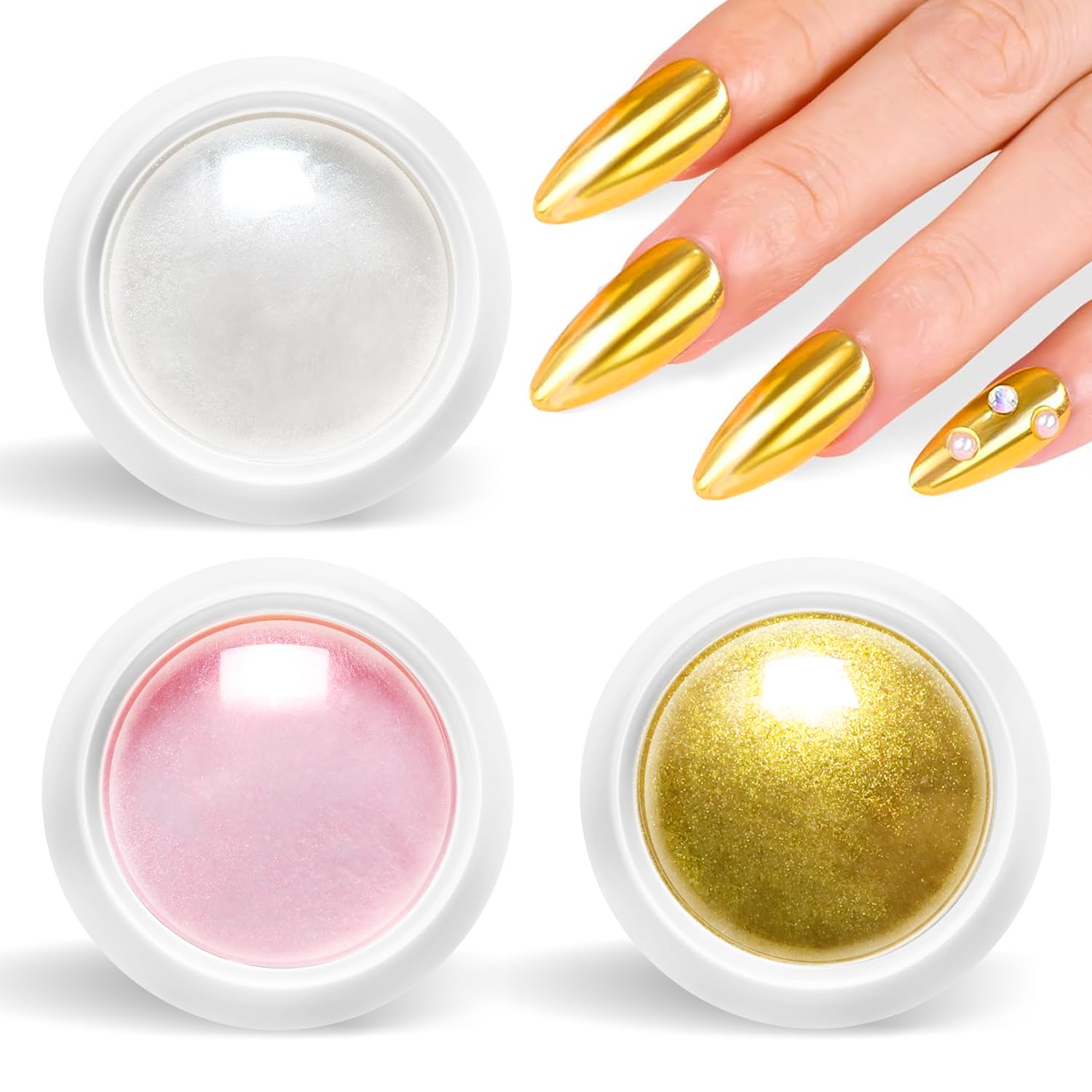 - Package Include: BISHENGYF chrome nail powder kit contains 3pcs nail powders (3pcs sponge sticks included), which gold white and pink chrome powder colors. This multi-coloured magic mirror powder is specially blended for your spring and summer, mix and match as you wish to show off your unique radiance!