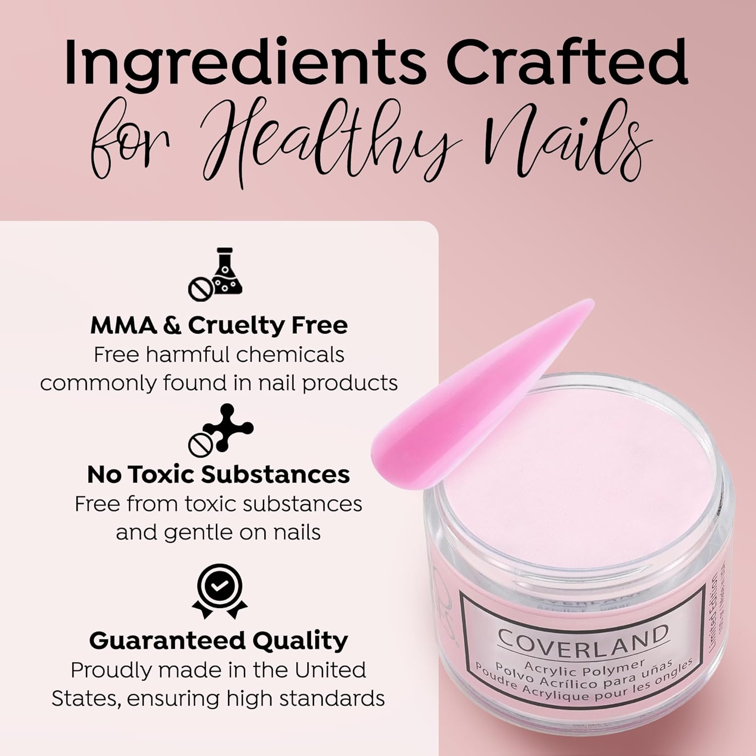 - āļøšššš šššššššš ššššš: The flexibility and adhesion properties of Coverland colored acrylic nail powder make it easy to shape nails with precision, and offers nice control for professionals who prefer to work with a polymerization rate of moderate to fast.