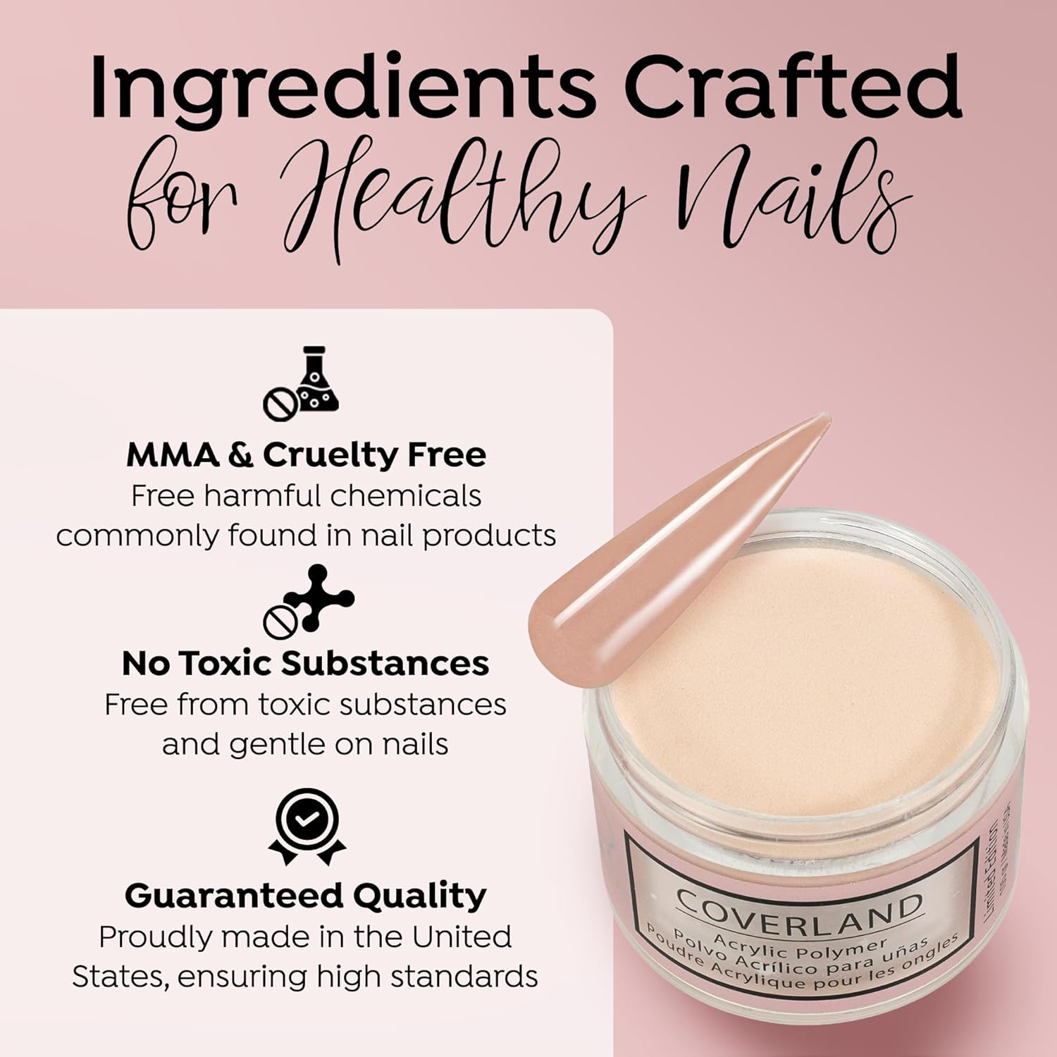 - āļøšššš šššššššš ššššš: The flexibility and adhesion properties of Coverland colored acrylic nail powder make it easy to shape nails with precision, and offers nice control for professionals who prefer to work with a polymerization rate of moderate to fast.