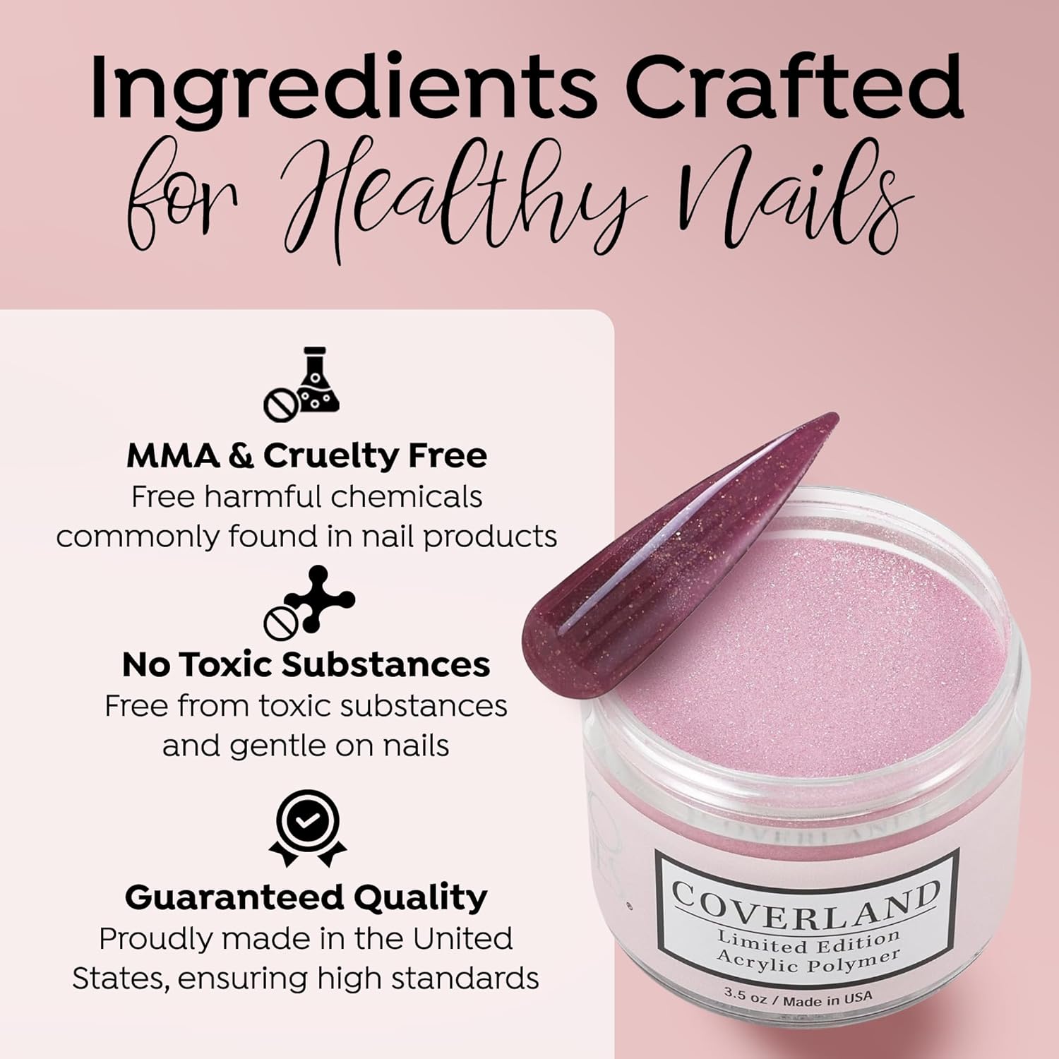 - āļøšššš šššššššš ššššš: The flexibility and adhesion properties of Coverland colored acrylic nail powder make it easy to shape nails with precision, and offers nice control for professionals who prefer to work with a polymerization rate of moderate to fast.
