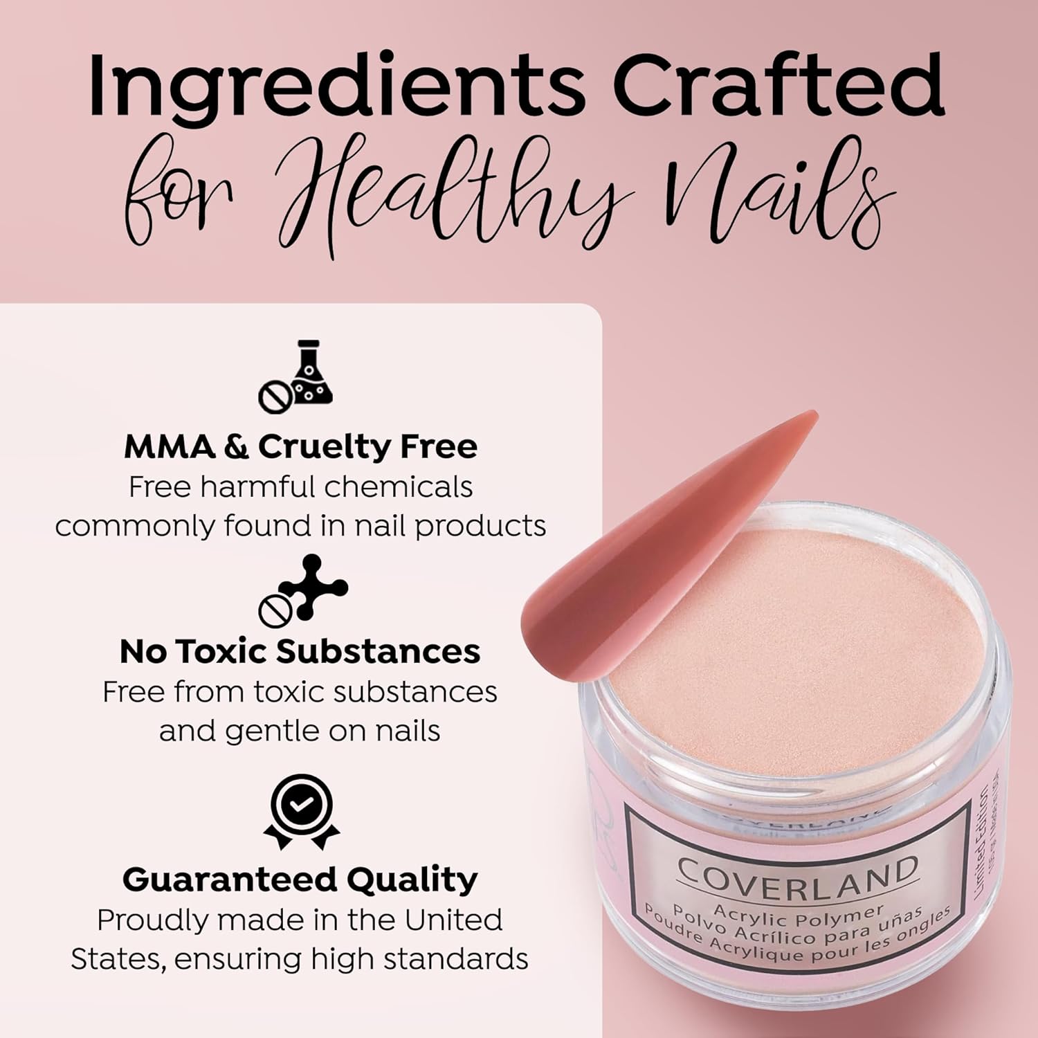 - ✔️𝐏𝐑𝐎𝐅𝐄𝐒𝐒𝐈𝐎𝐍𝐀𝐋 𝐆𝐑𝐀𝐃𝐄: The flexibility and adhesion properties of Coverland colored acrylic nail powder make it easy to shape nails with precision, and offers nice control for professionals who prefer to work with a polymerization rate of moderate to fast.