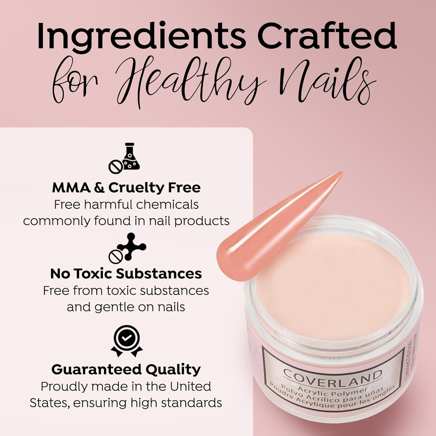 - āļøšššš šššššššš ššššš: The flexibility and adhesion properties of Coverland colored acrylic nail powder make it easy to shape nails with precision, and offers nice control for professionals who prefer to work with a polymerization rate of moderate to fast.