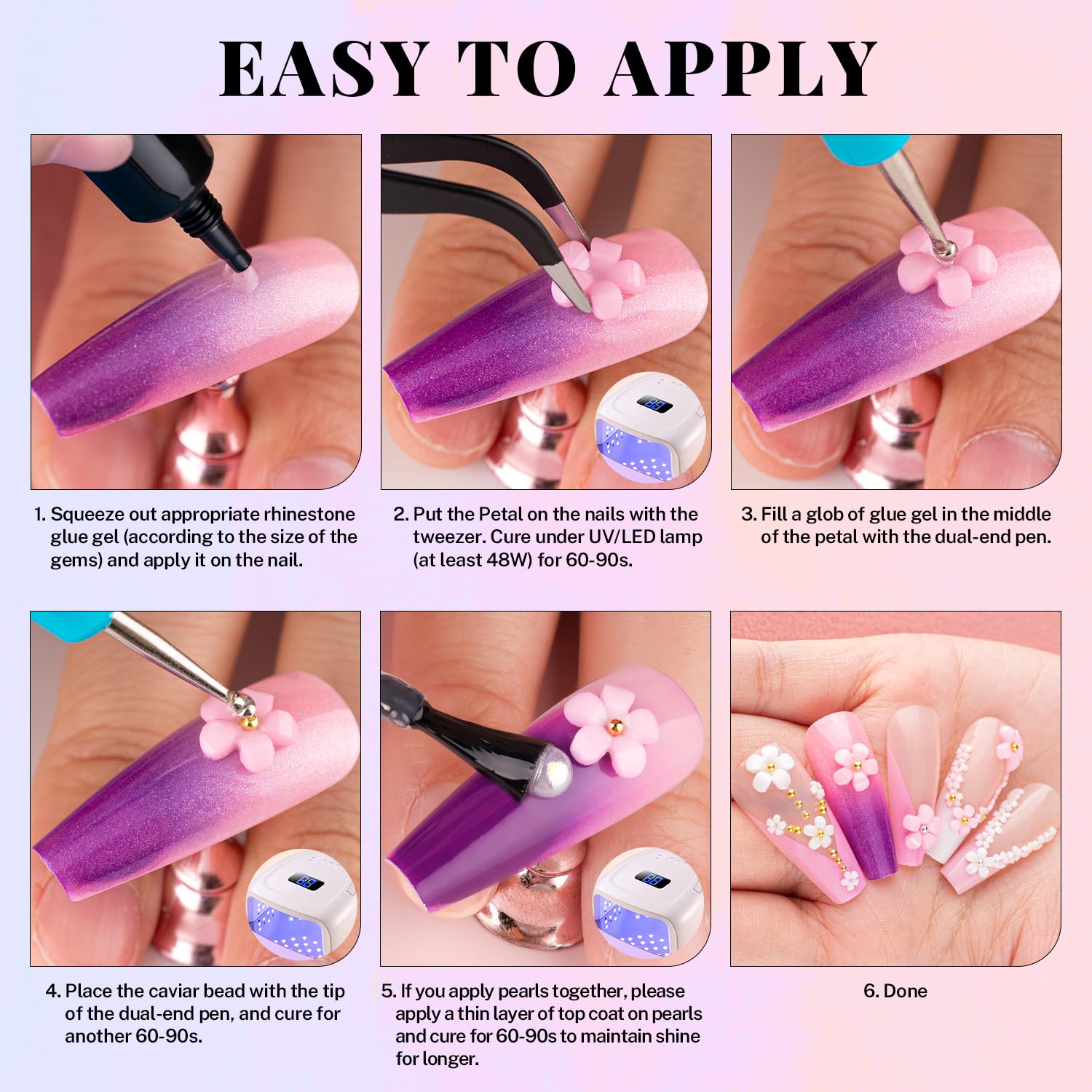 3D Nail Charms, Manicure Kit with Nail Rhinestone Glue Gel (UV Curing), Butterfly White Pink Flower Starry AB Gems Caviar Beads Half Round Pearl & Flatback Glass AB + Clear Gems with Dotting Tools