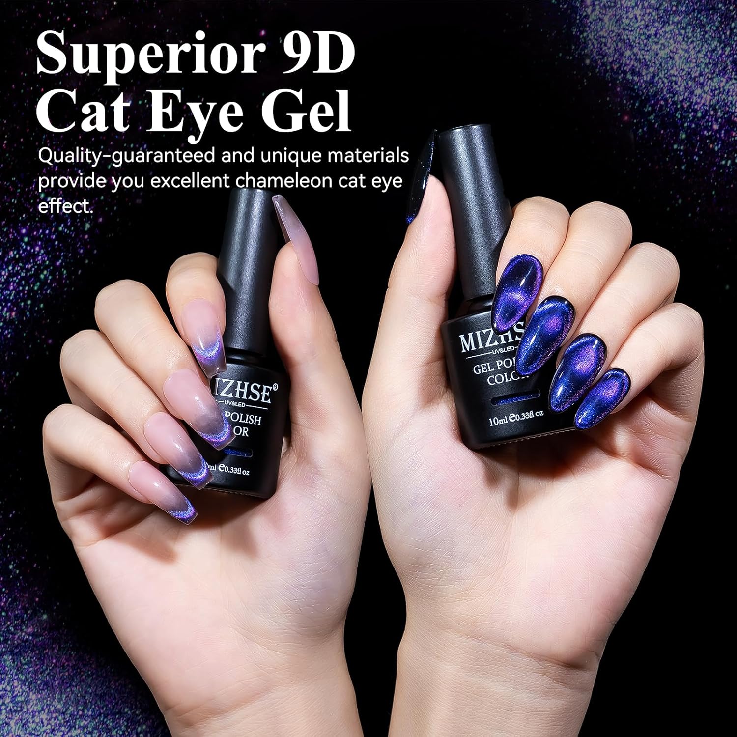 - MIZHSE 9D Cat Eye Gel Nail Polish: 1 color magnetic gel polish, 1 magnet stick, without black base. Save your money and time to nail salon! Enjoy the DIY fun of nail beauty at home. Suitable for natural nails, false nails, acrylic nails, etc.
