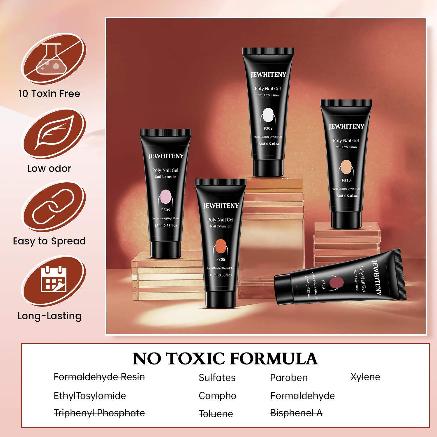 - Wide Range Of Applications And The Perfect Gift: JEWHITENY poly nail gel kits is perfect for creating a variety of stunning nail designs with rhinestone nails,dry flower and glitter , as well as nail art on press-on nails. This builder nail gel is suitable for creating different nail extension shapes, such as square, oval, coffin, and French nails.This poly extension gel nail kit is the perfect gift for all nail lovers.