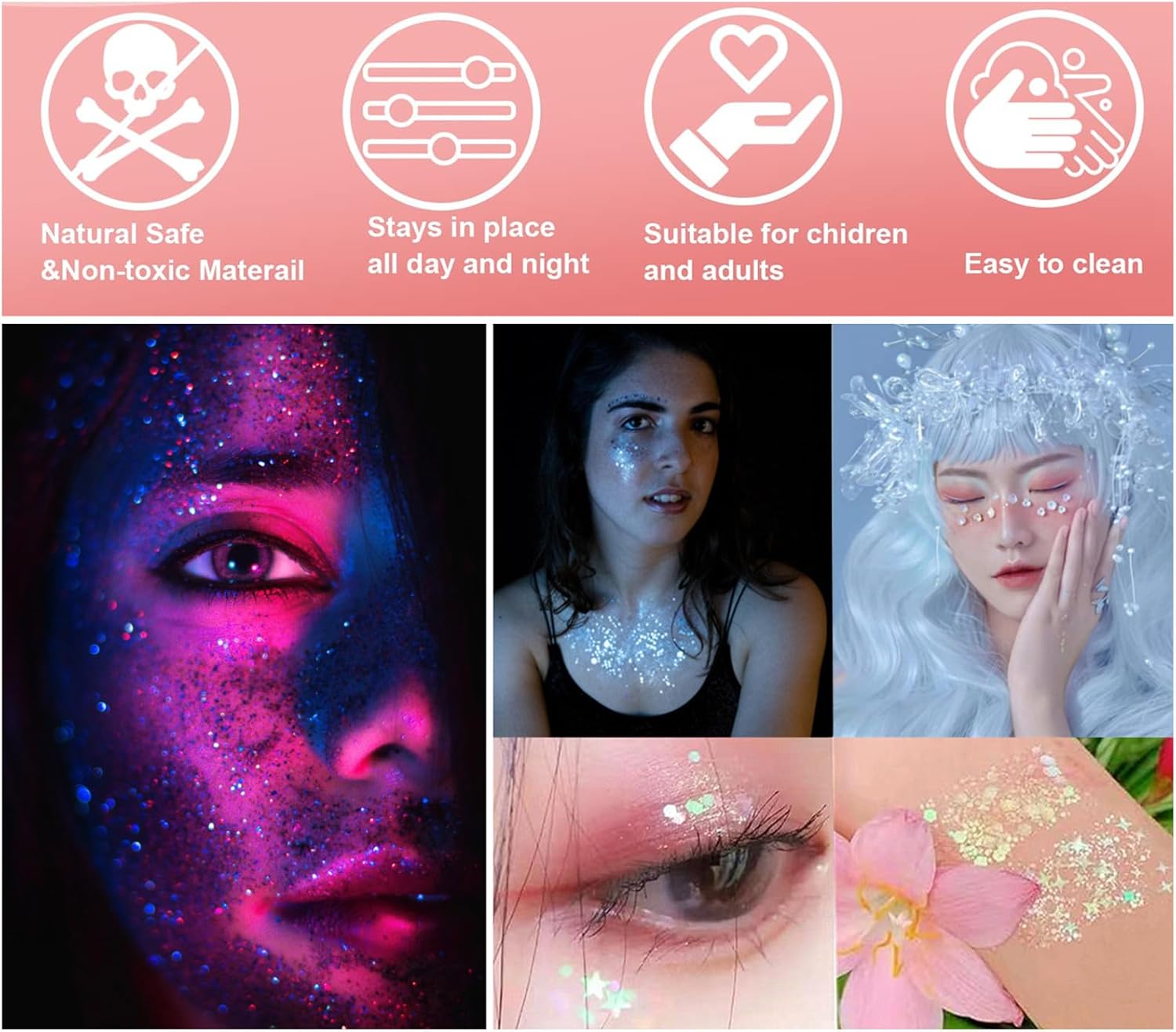 - 【Long Lasting Black Face Body Glitter】Shine and durable black face paint holographic chunky glitter sequin gel,great for face,body,hair,eye,lip,nails glitter makeup and so on.You can easily use directly.It is self-adhesive sticky,non-sticky after dries,pretty for playing glitter dress up and body glitter paint .Unique safe material formula,it was long lasting like new after lots of sweat.
