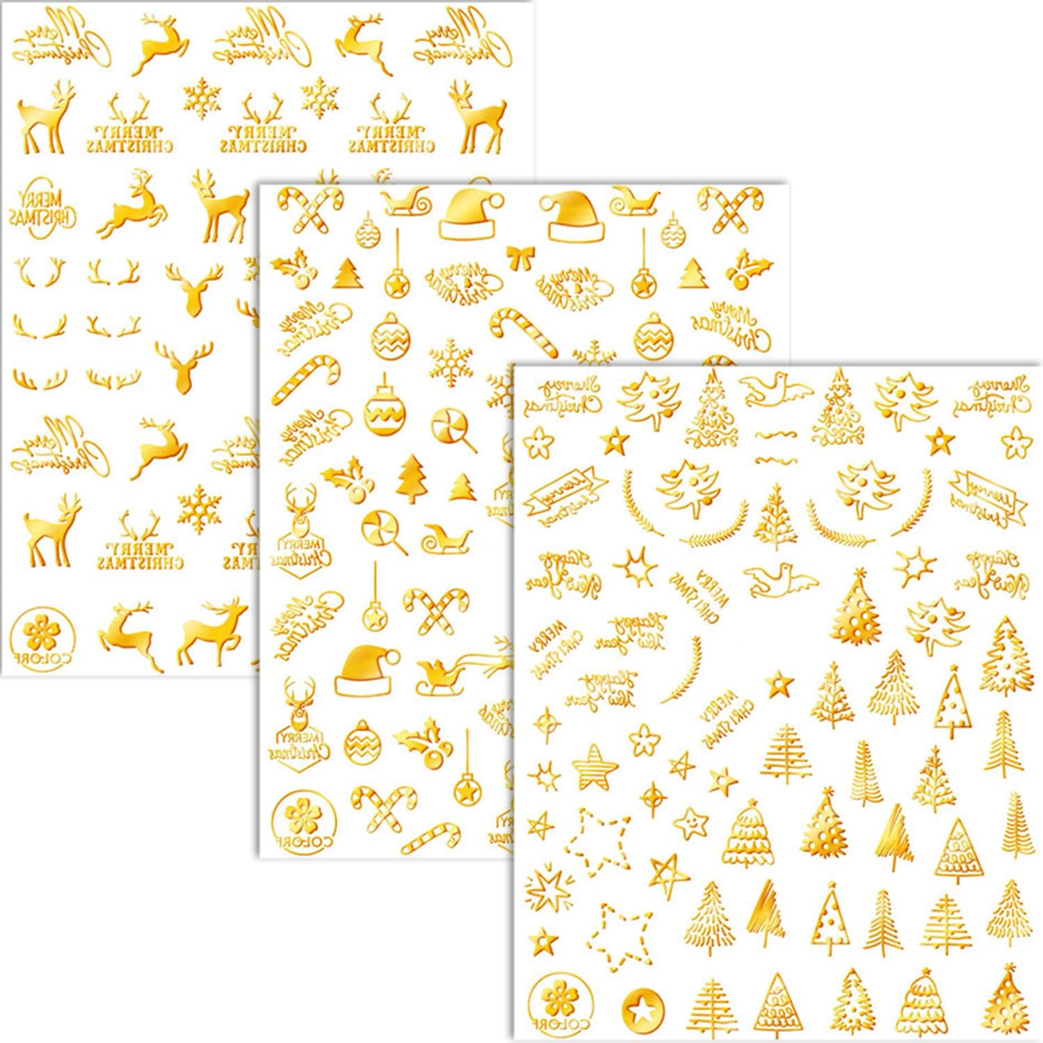 HNUIX Nail Stickers - 3D Christmas, Self Adhesive Nail Decals, Multi Pattern, Gold, 9 Sheets, for Nail Art