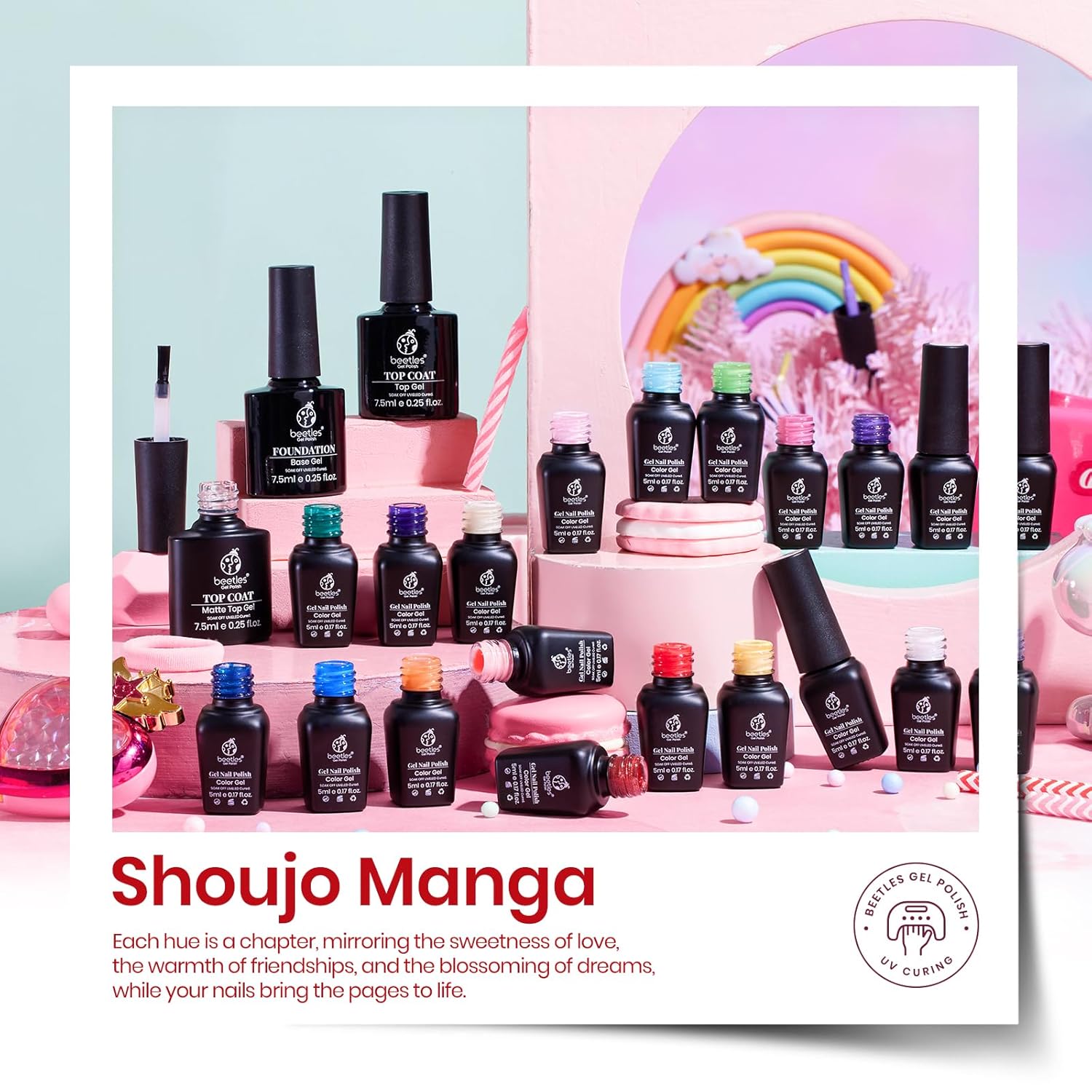 beetles Gel Polish Set, 23pcs Rainbow Gel Nail Polish Pink Orange Green Red Glitter Color with Base Glossy and Matte Top Coat Manicure Kit Shoujo Manga Soak Off Uv Led Gifts for Women